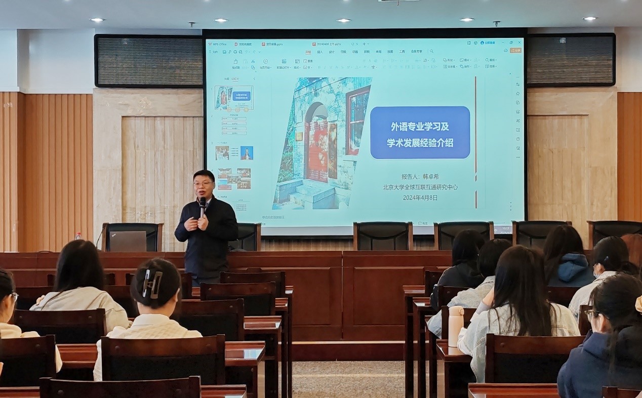 48日上午,外國語學(xué)院在邑校區(qū)圖書館第一會議室舉辦校友課堂之“外語專業(yè)學(xué)習(xí)及學(xué)術(shù)發(fā)展經(jīng)驗介紹”。2014級英語專業(yè)畢業(yè)生、北京大學(xué)全球互聯(lián)互通中心助理研究員韓卓希應(yīng)邀擔(dān)任主講,學(xué)院90余名本科生聽取講座。講座由院黨委副書記王業(yè)青主持。