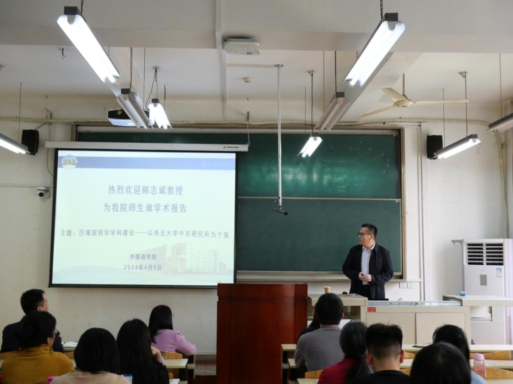 為推進(jìn)我校區(qū)域國別學(xué)學(xué)科建設(shè),2024年4月9日下午,外國語學(xué)院邀請(qǐng)西北大學(xué)社科處處長、中東研究所所長、博士生導(dǎo)師韓志斌教授,在東方石油樓1104教室,做《區(qū)域國別學(xué)學(xué)科建設(shè)——以西北大學(xué)中東研究所為個(gè)案》專題報(bào)告。學(xué)院黨委書記田虹霞、副院長劉輝、陳武、學(xué)院教師聆聽了此次報(bào)告。報(bào)告由副院長劉輝主持。