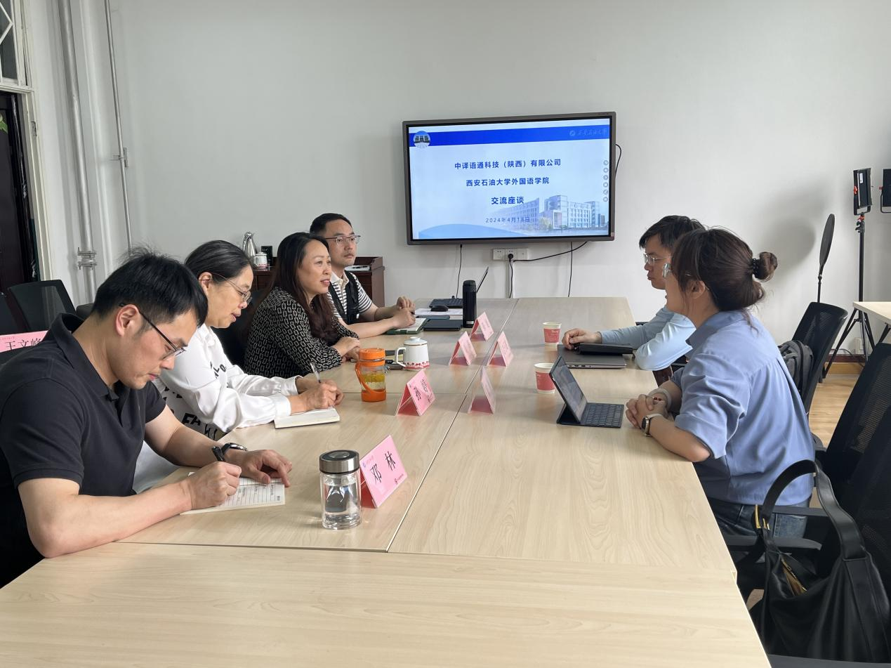 4月18日下午,中譯語通科技(陜西)有限公司語言服務(wù)事業(yè)群總監(jiān)陳棟、數(shù)據(jù)運(yùn)營部總監(jiān)吉子瓏一行到訪外國語學(xué)院,主要圍繞區(qū)域國別研究進(jìn)行了合作交流研討。會議由外國語學(xué)院副院長劉輝主持,俄語專業(yè)負(fù)責(zé)人孫婷、多語種部副主任陳旭、英語系副主任鄧林參加了交流研討。
