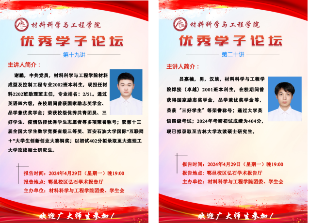為充分發(fā)揮優(yōu)秀大學(xué)生的朋輩榜樣作用,營造見賢思齊良好學(xué)習(xí)風(fēng)氣,向廣大備考學(xué)子提供寶貴的經(jīng)驗借鑒,幫助學(xué)生更好地規(guī)劃考研之路。429日晚,材料科學(xué)與工程學(xué)院在鄠邑校區(qū)圖書館弘石學(xué)術(shù)報告廳舉辦優(yōu)秀學(xué)子論壇第十講和第二十講,本期邀請到的優(yōu)秀學(xué)子是我院材料成型及控制工程專業(yè)謝鵬同學(xué),目前以初試402分?jǐn)M錄取至大連理工大學(xué)攻讀碩士研究生;焊接技術(shù)與工程專業(yè)(卓越班)呂嘉楠同學(xué),以初試404分?jǐn)M錄取至吉林大學(xué)攻讀碩士研究生。學(xué)院300余名本科生參加論壇。