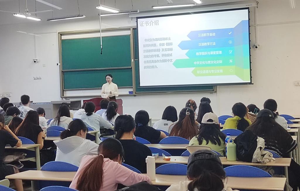 西安外國語大學考試認證中心張青及工作人員一行,為學生帶來了一場關于國際中文教師證書考試及孔子學院志愿者項目介紹的宣講會,圍繞國際中文教師證書簡介、考試內容、證書用途、國際中文教師志愿者和備考指南等五個方面來進行詳細的介紹,著重講解了國際漢語教師志愿者應具備的知識與能力,專業(yè)知識學習的方法和規(guī)劃,使同學們對《國際中文教師證書》有了全面了解和新的認識。西安外國語大學考試認證中心楊琛老師結合自己在國外工作和求學成長的經歷,分享自己在柬埔寨做國際中文教師志愿者的工作經歷和國外生活的感悟,鼓勵激勵同學們夯實專業(yè)基礎、積極實踐、打開視野、拓寬未來的就業(yè)思路,勇敢走出去積極傳播中華文化。