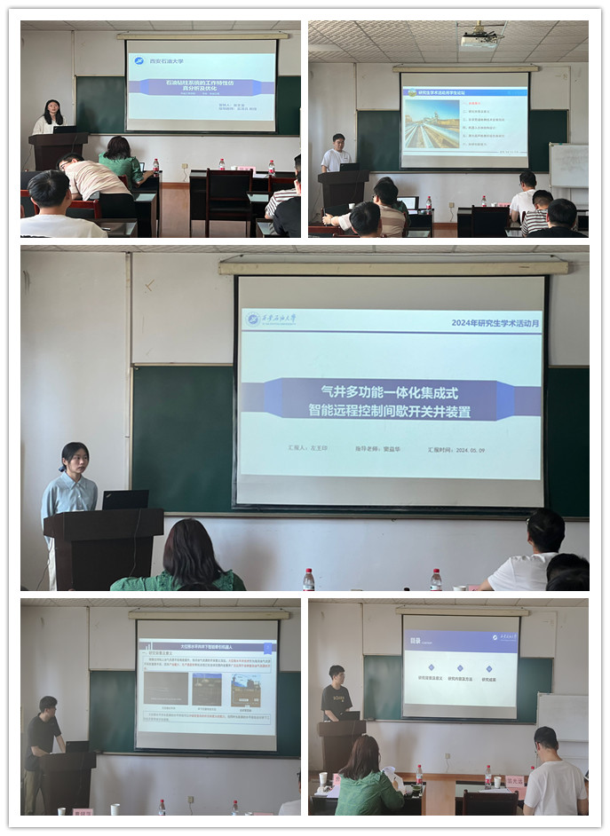2021級(jí)研究生張文溪和裴龍瑤、2022級(jí)研究生尚祖躍、左王印和王亨通,分別作了題為《石油鉆柱系統(tǒng)的工作特性仿真分析及優(yōu)化》《超音速分離管內(nèi)自發(fā)凝結(jié)及氣液分離過(guò)程研究》《管道檢測(cè)機(jī)器人關(guān)鍵技術(shù)》《氣井多功能一體化集成式智能遠(yuǎn)程控制間歇開(kāi)關(guān)井裝置》《大位移水平井井下智能牽引機(jī)器人》的報(bào)告。