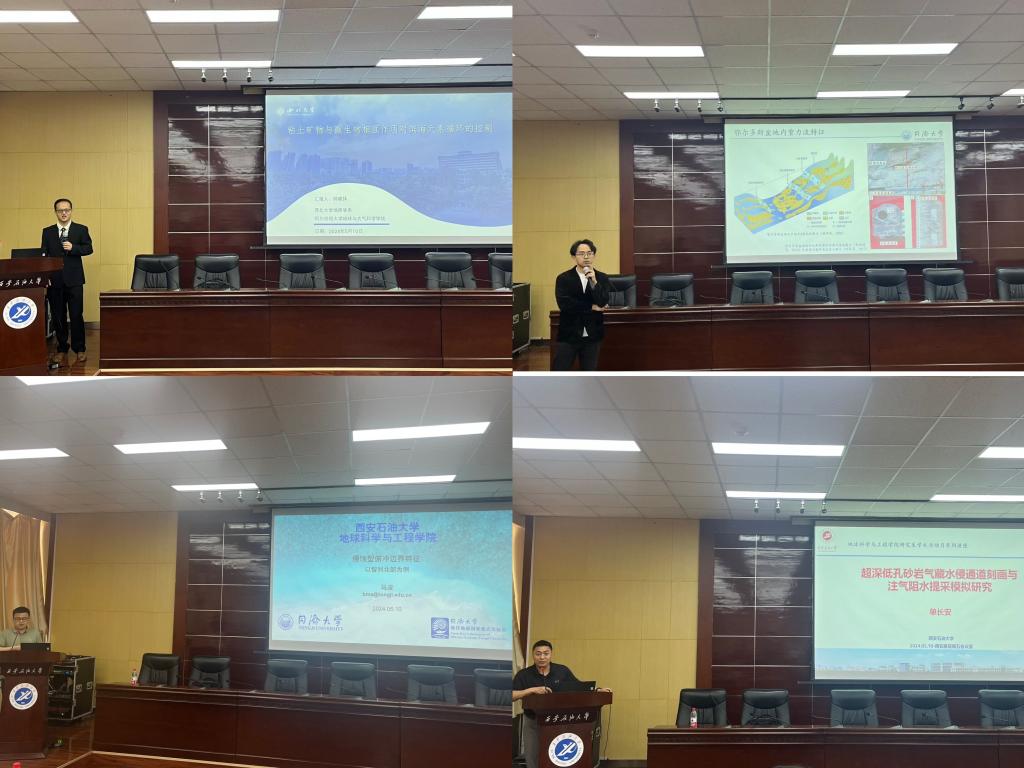 在大會(huì)報(bào)告環(huán)節(jié),西北大學(xué)教授、國(guó)家優(yōu)青郝威鐸,同濟(jì)大學(xué)研究員、上海市領(lǐng)軍人才吳南,同濟(jì)大學(xué)研究員、上海市白玉蘭人才馬波以及西安石油大學(xué)副教授單長(zhǎng)安為師生們作了精彩紛呈的學(xué)術(shù)報(bào)告。其中,郝威鐸教授作了題為《粘土礦物與微生物相互作用對(duì)濱海微量元素循環(huán)的控制》的專題報(bào)告;吳南研究員作了題為《深海重力流的識(shí)別標(biāo)志與油氣地質(zhì)意義》的專題報(bào)告;馬波研究員作了題為《侵蝕型俯沖邊界特征-以智利北部為例》的專題報(bào)告;單長(zhǎng)安副教授作了《超深低孔砂巖氣藏水侵通道刻畫與注氣阻水提采模擬研究》的專題報(bào)告。報(bào)告結(jié)束后,4位校內(nèi)外專家與現(xiàn)場(chǎng)師生進(jìn)行了深入的交流和討論,現(xiàn)場(chǎng)氣氛熱烈。最后,副院長(zhǎng)黨偉對(duì)4位專家?guī)淼木蕡?bào)告表示感謝,并提到此次報(bào)告拓寬了專業(yè)研究視野,為多學(xué)科交叉研究注入新的理念,全體師生獲益良多。