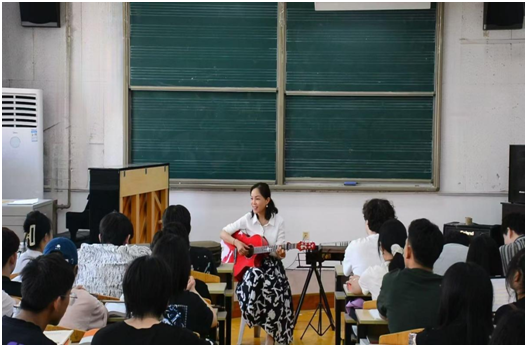 12周教學(xué)任務(wù)很快結(jié)束。5月15日是結(jié)課的日子,5月14日晚廖老師左手小指受傷,一彈琴就鉆心疼痛。為了兌現(xiàn)與同學(xué)們的約定,廖老師決定不改計劃,在課堂上向同學(xué)們展示學(xué)習(xí)不滿三個月的新技能——吉他彈唱給同學(xué)們聽。