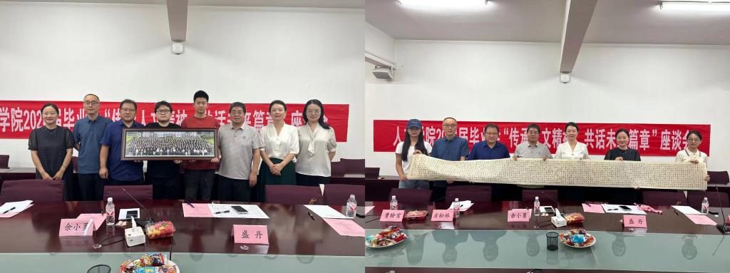 座談會后,畢業(yè)生們向?qū)W院贈送2024屆全體本科畢業(yè)生合影,畢業(yè)生夏妍月向?qū)W院贈送書法長卷作品《大學》,領導老師向畢業(yè)生贈送紀念禮物。