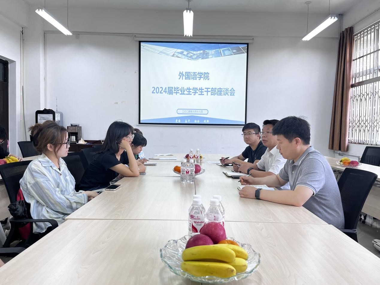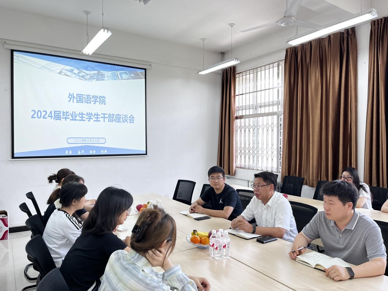 為進一步加強學院與畢業(yè)生的溝通交流,引導畢業(yè)生系好走向社會的“第一粒扣子”,外國語學院根據(jù)2024屆畢業(yè)生“畢業(yè)季”相關(guān)活動安排,6月18日在崇文樓314召開2024屆畢業(yè)生學生干部座談會。學院黨委副書記王業(yè)青,學生工作辦公室主任周宇,畢業(yè)班輔導員陳浩及2024屆畢業(yè)生學生干部代表20余人參加了座談會。
