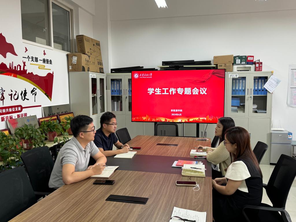 為深入貫徹落實學(xué)校第三次黨代會精神,高質(zhì)量完成校黨委“一校一策”選題“推動新能源學(xué)院高質(zhì)量發(fā)展”的目標(biāo)任務(wù),6月28日下午,新能源學(xué)院學(xué)生工作專題會議在鄠邑校區(qū)天工樓223室召開,學(xué)院全體學(xué)工干部參會,會議由學(xué)院黨委副書記劉煒航主持。
