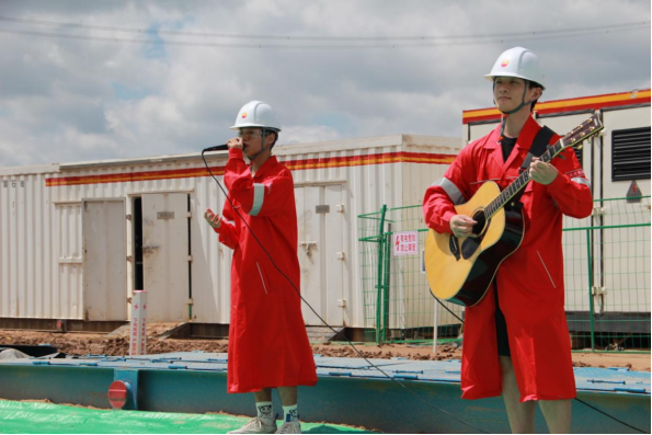 前期準(zhǔn)備中,何云老師利用假期時(shí)間,悉心指導(dǎo)參演學(xué)生準(zhǔn)備與排練,將鐵人精神與實(shí)踐教學(xué)相結(jié)合,精心準(zhǔn)備了一系列經(jīng)典曲目。8月26日于50072鉆井隊(duì),常超凡演唱的《石油人的歌》中拉開演出序幕,迅速調(diào)動(dòng)起了石油工人們的熱情,贏得陣陣掌聲;由彭月懷演唱的民謠《春風(fēng)十里》讓一線石油工人疲憊的身體在這宜人溫馨的歌聲中能得到一絲放松;民歌《小白楊》唱出了一線石油工人的情懷;吉他彈唱《無名的人》則是對(duì)這些默默無聞、堅(jiān)守崗位的石油人鮮明的表達(dá)。