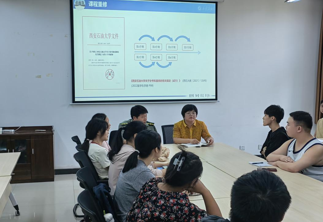會(huì)上,尹老師以《西安石油大學(xué)關(guān)于補(bǔ)考和重修的有關(guān)規(guī)定(試行)》(西石大教〔2021〕126號(hào))為切入點(diǎn),詳細(xì)講解了學(xué)籍異動(dòng)學(xué)生關(guān)心的各類課程問題;同時(shí)從學(xué)籍管理角度,再次提醒21級(jí)準(zhǔn)畢業(yè)生核對(duì)個(gè)人課程和成績(jī),尤其要對(duì)公共課加強(qiáng)查漏補(bǔ)缺,鼓勵(lì)他們第7學(xué)期課程務(wù)必好好學(xué)習(xí)全部通過。