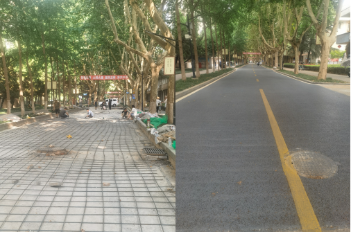 4.雁塔校區(qū)主干道路改造。雁塔校區(qū)主干道路面出現(xiàn)局部沉降、開裂,為保證行車安全。暑假期間,后勤處聯(lián)系海綿工程項目部對有問題的路面進行維修加固。本次海綿項目部維修加固路面約700平方米。