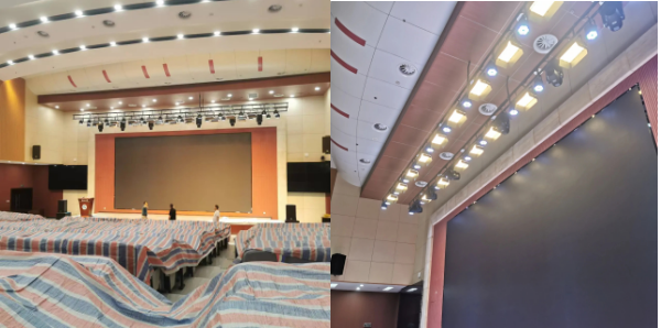 6.弘石報告廳燈光改造。為提升弘石報告廳的照明效果,滿足會議、演講、演出等活動需求,后勤處對燈光進行了改造。根據(jù)不同場景設計了燈光布局,確保照明清晰、均勻、無陰影。采用柔和光線和合理色溫,避免眩光,提升視覺舒適度,并選用節(jié)能燈具,降低能耗。