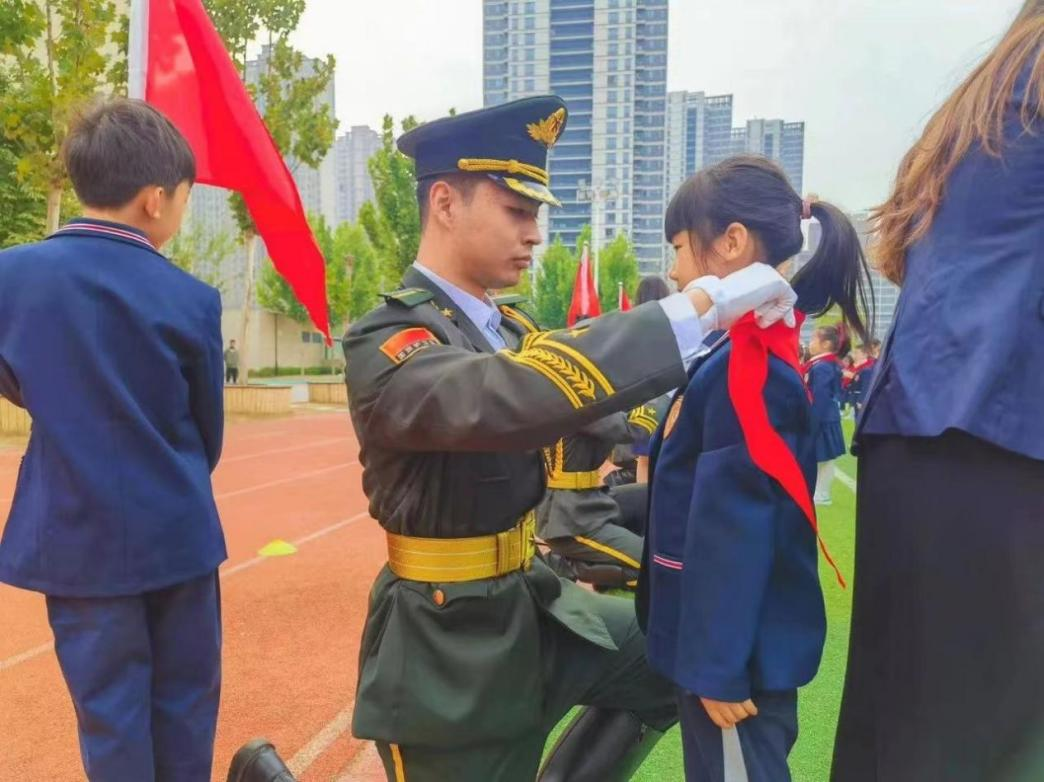 校領(lǐng)導、家長代表、中隊輔導員以及我校退役大學生士兵代表為新入隊少先隊員佩戴紅領(lǐng)巾,新隊員們此刻肩負起了傳承紅色基因、弘揚愛國精神的重任。