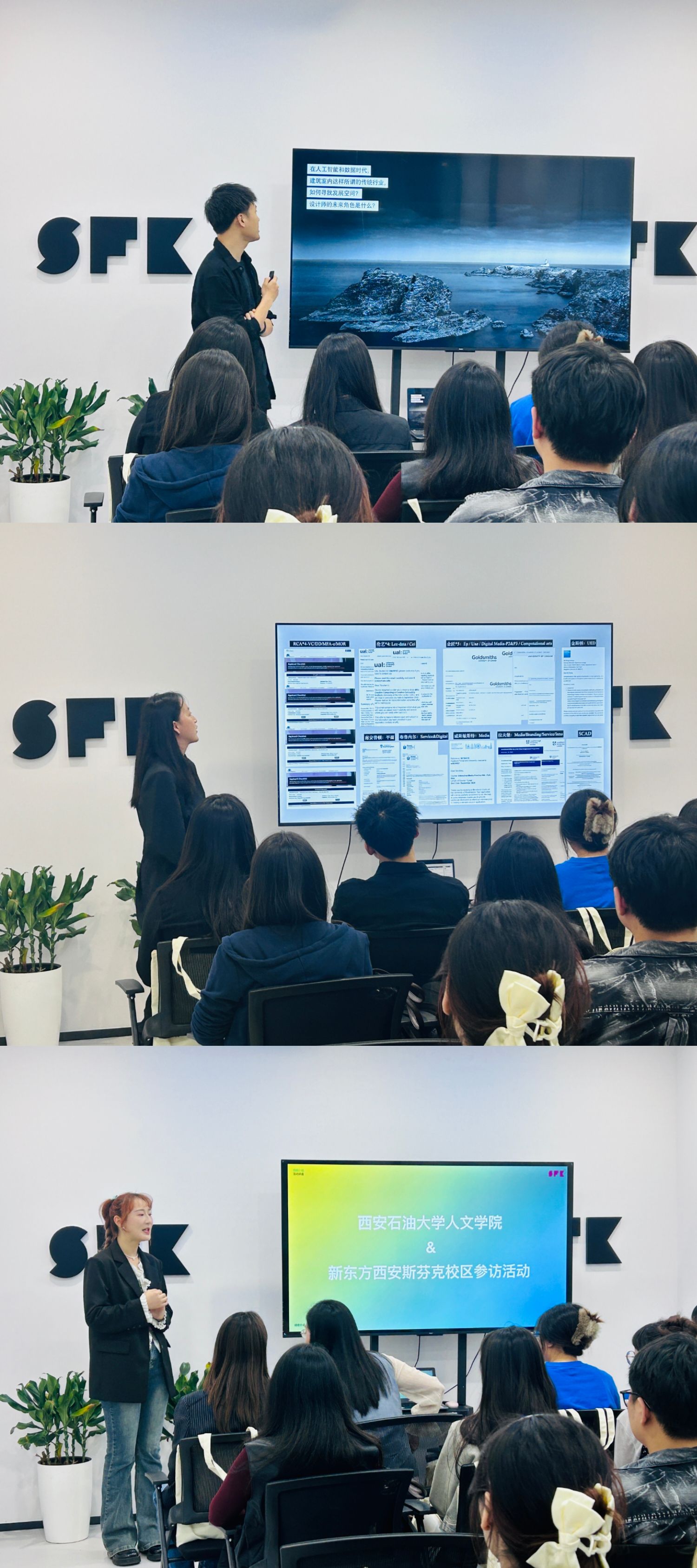 在帶隊老師的帶領(lǐng)下,參訪學(xué)生參觀了斯芬克西安校區(qū)的科系專業(yè)涵蓋、學(xué)習(xí)設(shè)備、學(xué)習(xí)環(huán)境以及各個專業(yè)學(xué)生的作品展示。參觀過后,校區(qū)講解老師開展了視覺傳達(dá)設(shè)計和環(huán)境設(shè)計兩類專業(yè)方向的講座,他們分別從學(xué)習(xí)目的、就業(yè)方向指導(dǎo)、行業(yè)發(fā)展趨勢以及國外高校新形勢等方向進(jìn)行了專業(yè)講解指導(dǎo),為同學(xué)解答了關(guān)于專業(yè)學(xué)習(xí)與就業(yè)相關(guān)的問題。