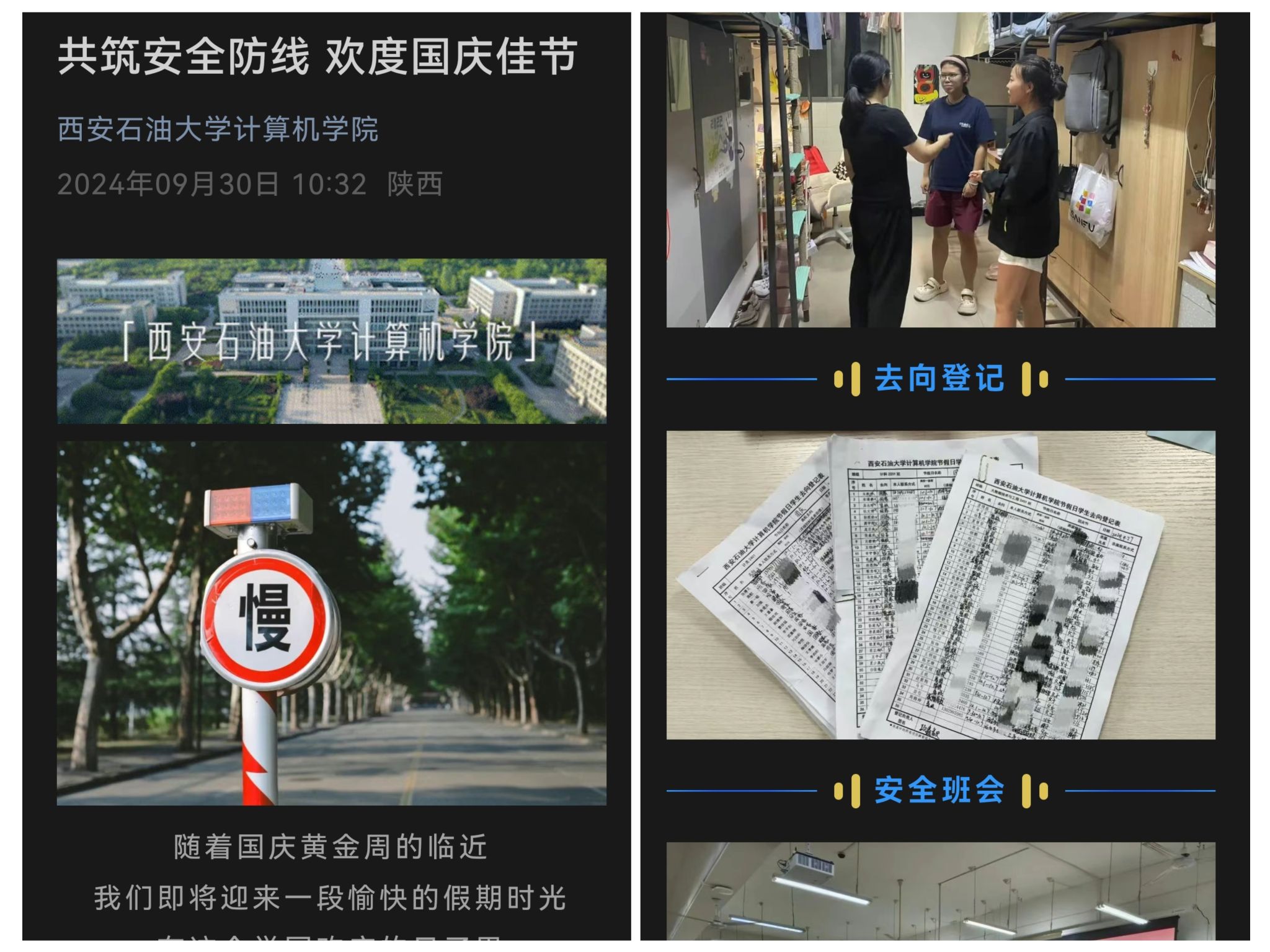 一是在國(guó)慶節(jié)前夕,學(xué)院通過(guò)公眾號(hào)推送《共筑安全防線 歡度國(guó)慶佳節(jié)》微信推文,各年級(jí)通過(guò)召開年級(jí)大會(huì)、走訪學(xué)生宿舍、假期去向登記、安全主題班會(huì)、假期出行安全小貼士等方式,引導(dǎo)同學(xué)們做好自己安全的第一責(zé)任人,確保自身健康安全和學(xué)校的和諧穩(wěn)定。