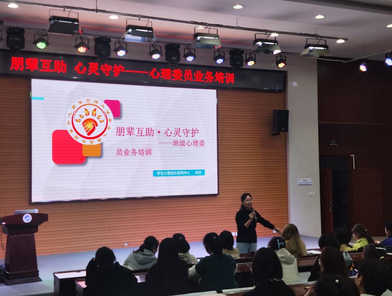 1030日晚上7:30,學(xué)生心理成長指導(dǎo)中心主任肖瓊在鄠邑校區(qū)崇文樓118報告廳為全體2024級本科生和研究生班級心理委員及新任職心理委員們做了主題為朋輩互助、心靈守護的業(yè)務(wù)培訓(xùn)。