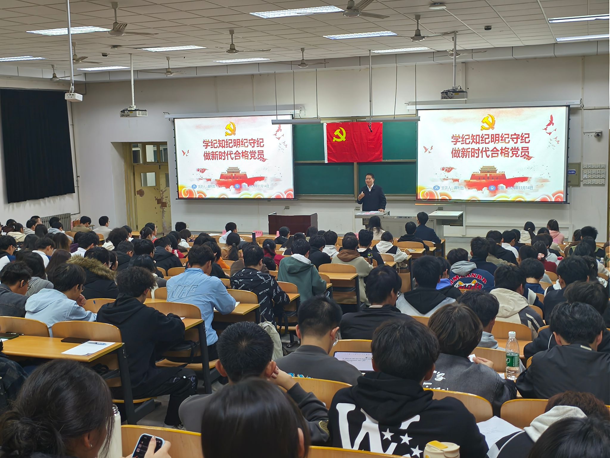 開班儀式后,理學院黨委書記席利哲作了培訓班第一講。他以《學紀知紀明紀守紀,做新時代合格黨員》為主題,通過與多名同學互動提問的方式深入淺出地講解了新時代合格黨員的標準和內涵,一要講政治、有信念,確保在鑄魂立根上合格;二要講規(guī)矩、有紀律,確保在遵規(guī)守紀上合格;三要講道德、有品行,確保在崇德修身上合格;四要講奉獻、有作為,確保在干事創(chuàng)業(yè)上合格。他指出,學紀、知紀、明紀、守紀是每個黨員的必修課,學紀是基礎,知紀是前提,明紀是根本,守紀是關鍵,要深刻認識黨的紀律在教育引導、警示預防、懲戒糾錯方面的功能,自律和他律相結合的實質,以及加強黨的紀律建設的重要性。他為全體參訓學員解讀了《中國共產黨紀律處分條例》的主要內容和負面清單,以典型案例生動詮釋了黨的紀律的嚴肅性和權威性。最后,他鼓勵大家努力學習,爭取早日入黨,把遵規(guī)守紀內化為思想和行動自覺,敬畏法紀,從小事做起,在日常堅守,以新時代合格黨員的標準嚴格要求自己,跑好中國式現代化的接力棒,在民族復興的宏偉征程中寫就青春的華彩篇章。