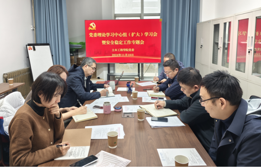 11 月 18 日,土木工程學院黨委召開2024年11月理論學習中心組(擴大)學習會暨安全穩(wěn)定專題會,學院理論學習中心組成員及各辦公室主任、實驗室主任和系主任參加會議。會議由學院黨委書記賈莉娜主持。