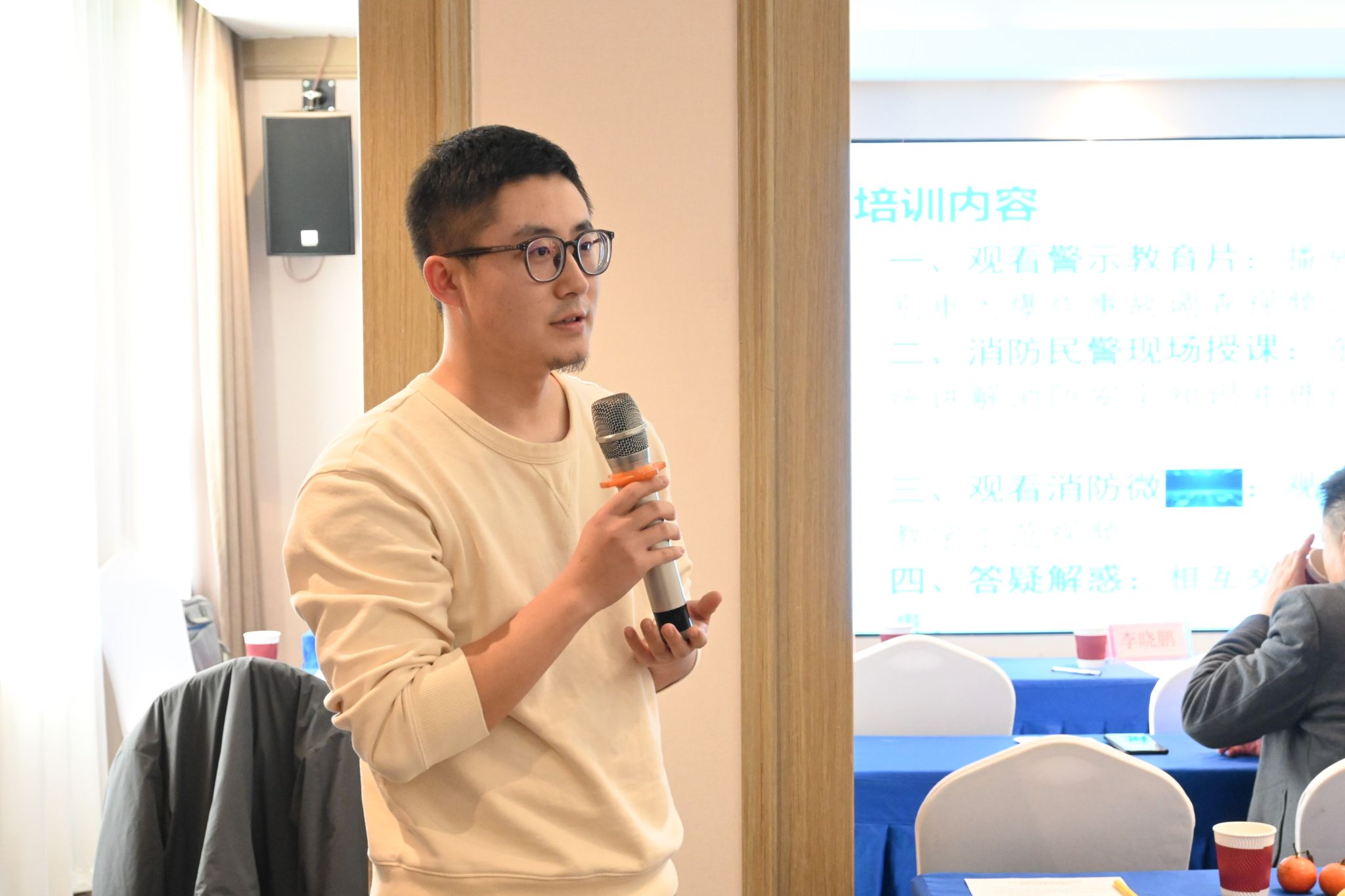 會議第三項,由東儀路派出所李曉鵬警官向與會人員現(xiàn)場授課,系統(tǒng)講解防詐反詐、消防安全等知識,并演示消防設備使用方法。