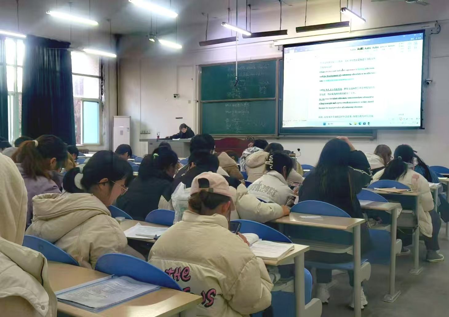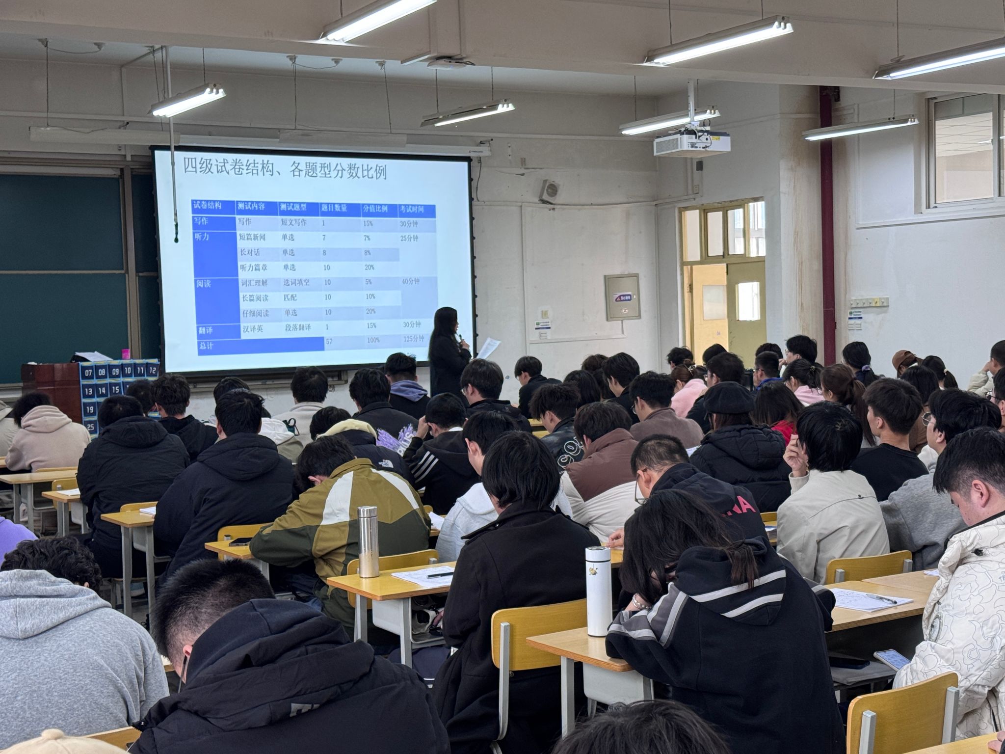 學(xué)院邀請(qǐng)外國(guó)語(yǔ)學(xué)院張磊、蔡曉青兩位專業(yè)老師,從11月19日開(kāi)始,采用“模擬考試+試題解析”的方式系統(tǒng)講授往年四級(jí)考試真題或模擬題,學(xué)院2022級(jí)、2023級(jí)310名本科生分兩個(gè)大教室參加四級(jí)系列輔導(dǎo)。將“專家老師”的專業(yè)優(yōu)勢(shì)和“精準(zhǔn)打靶”的目標(biāo)優(yōu)勢(shì)相結(jié)合,在為期一個(gè)月的系統(tǒng)學(xué)習(xí)中,有效提高學(xué)生應(yīng)試能力。