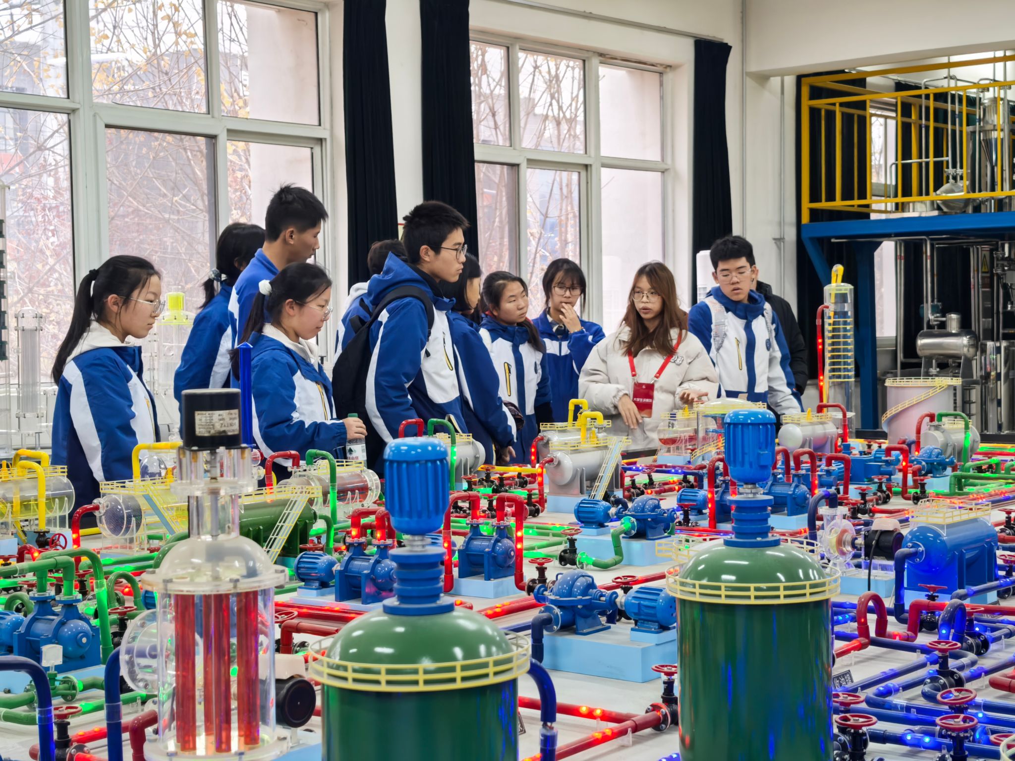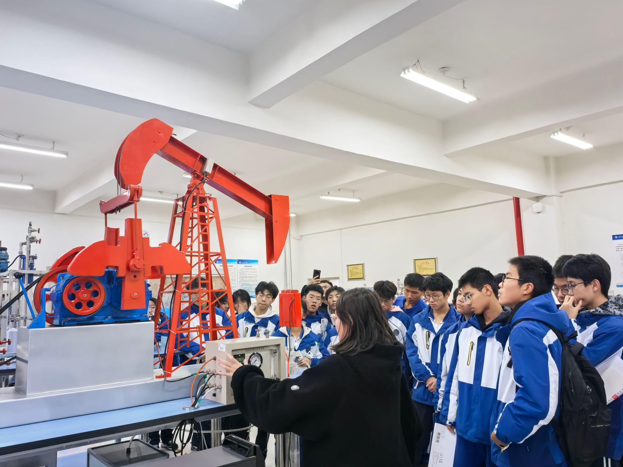 研學(xué)活動(dòng)最后一站參觀了我校陜西省石油石化虛擬仿真實(shí)驗(yàn)教學(xué)中心。在講解員的帶領(lǐng)下,五高師生參觀了鉆井實(shí)訓(xùn)室、地質(zhì)標(biāo)本實(shí)訓(xùn)室、采油實(shí)訓(xùn)室、油氣分布沙盤、集輸、煉化實(shí)訓(xùn)室、采油實(shí)訓(xùn)室,使學(xué)生初步了解了石油勘探、開采和運(yùn)輸?shù)娜^程,近距離感受到了石油石化及地質(zhì)行業(yè)的魅力與挑戰(zhàn)。