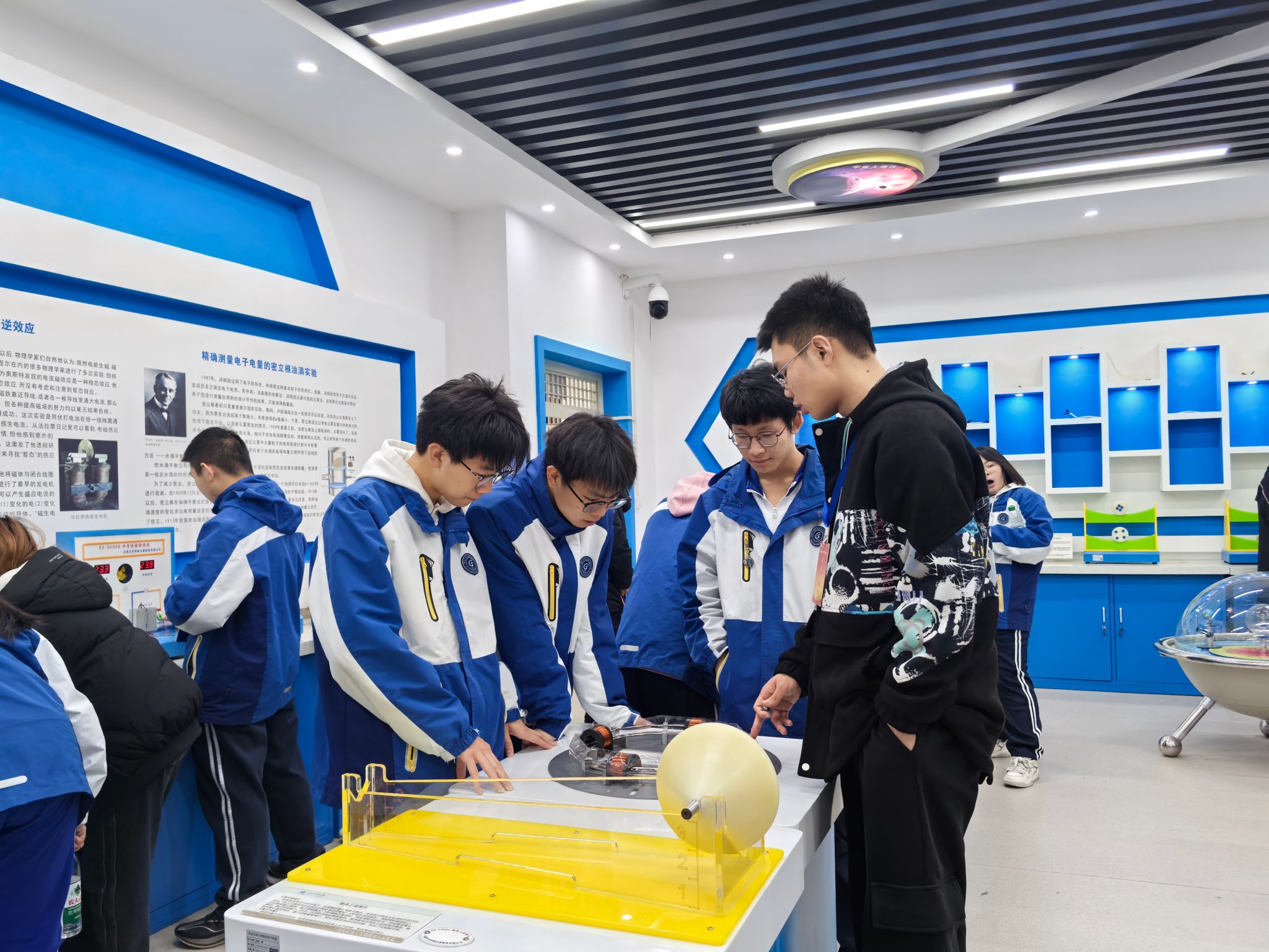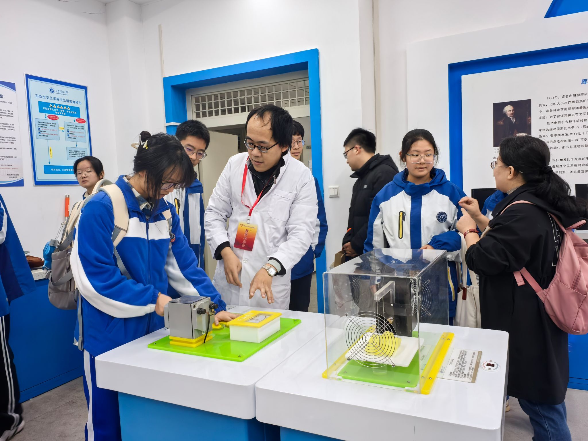 研學(xué)活動(dòng)第二站來到理學(xué)院物理演示實(shí)驗(yàn)室。物理演示實(shí)驗(yàn)室是陜西省科普教育基地,是集圖像演示、實(shí)物操作等功能為一體的開放性實(shí)驗(yàn)室,涵蓋了力學(xué)、電磁學(xué)、光學(xué)、熱學(xué)等方面知識(shí)。理學(xué)院師生志愿者分組帶領(lǐng)五高師生進(jìn)入實(shí)驗(yàn)室,逐一演示了引人入勝的雅各布天梯,生動(dòng)展現(xiàn)了電流的神秘躍動(dòng)等,讓參觀者直觀感受到能量轉(zhuǎn)換的奇妙過程;震撼人心的電磁炮發(fā)射,以直觀、震撼的方式詮釋了電磁力的強(qiáng)大威力。這些精心設(shè)計(jì)的演示活動(dòng),不僅激發(fā)了學(xué)生對(duì)物理學(xué)奧秘的好奇心與探索欲,更為大家搭建起了一座通往科學(xué)殿堂的橋梁,讓物理之美躍然眼前,深入人心。