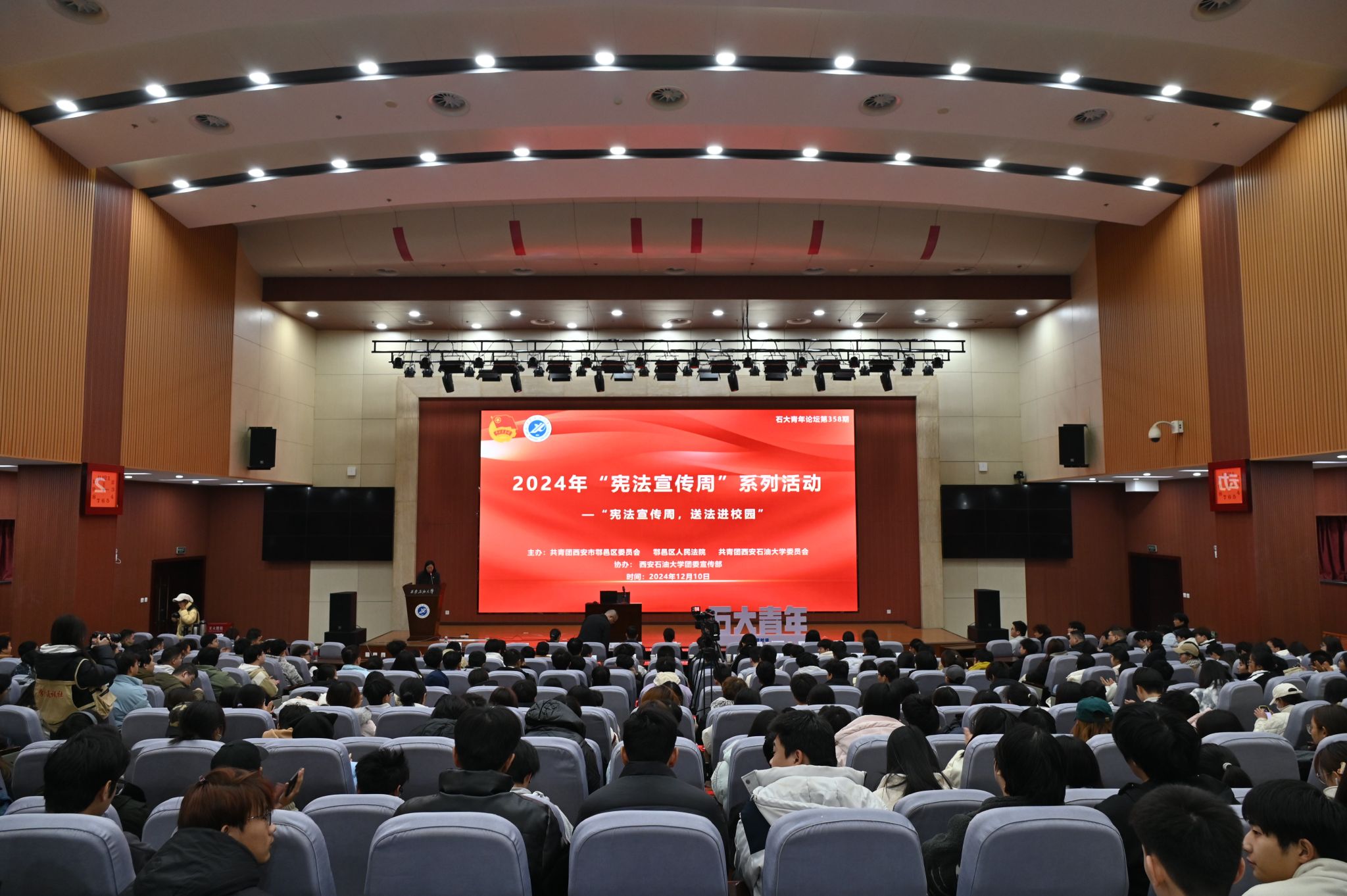 為促進(jìn)我校大學(xué)生深入學(xué)習(xí)憲法知識(shí)、維護(hù)憲法權(quán)威,營(yíng)造校園法治氛圍,12月10日下午,校團(tuán)委聯(lián)合西安市鄠邑區(qū)人民法院,在鄠邑校區(qū)弘石學(xué)術(shù)報(bào)告廳開(kāi)展2024年“憲法宣傳周”系列活動(dòng)—“憲法宣傳周,送法進(jìn)校園”主題的石大青年論壇。西安市鄠邑區(qū)人民法院一級(jí)法官?gòu)堄昵?、法官助理?xiàng)钕驑s主講,共青團(tuán)西安市鄠邑區(qū)委員會(huì)書(shū)記張洪雷、西安石油大學(xué)團(tuán)委書(shū)記王剛、西安市鄠邑區(qū)人民法院團(tuán)支部書(shū)記叢雅晨、西安市鄠邑區(qū)青聯(lián)委員、青企協(xié)會(huì)員、鄉(xiāng)創(chuàng)客聯(lián)盟成員代表出席。我校400余名學(xué)生參加本次論壇。