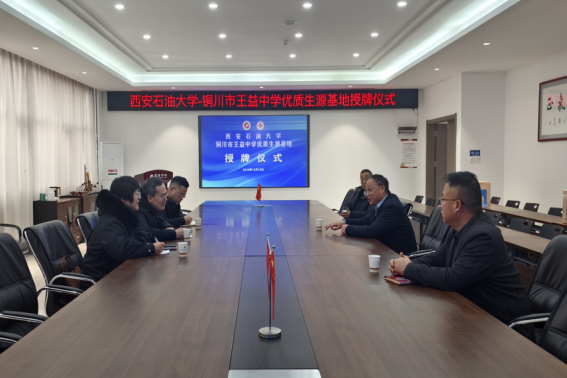 張新奇代表銅川王益中學(xué)對我院一行來校共建“優(yōu)秀生源基地”表示熱烈歡迎和衷心感謝,并介紹了學(xué)校的辦學(xué)規(guī)模、辦學(xué)精神、校園文化及近年來的發(fā)展情況。希望通過此次授牌,進(jìn)一步加強(qiáng)雙方交流合作,幫助學(xué)生充分了解西安石油大學(xué)相關(guān)招生情況。
