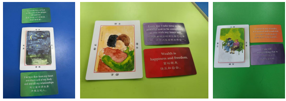 本次活動主題為“卡牌心橋—與自己對話”,意在通過歐卡牌讓同學們更深入、更直觀地感受到自身心理映射和情緒體驗,并通過交流分享,助力大家避免壓抑、開放身心?;顒娱_始,同學們隨機分為三個小組,李夏凝讓每位同學以動物自比,幫助大家初步了解個人性格和特質。隨后,進行歐卡牌團訓,同學們分四次分別抽取彩虹卡、圖卡、字卡、彩虹卡,并圍繞卡牌內容、選擇理由、自身感受等進行分享。最后,李夏凝邀請有分享意愿的同學進行發(fā)言,講述自身體會,并以此為衍伸,鼓勵同學們在生活中要敢說、想說、多說,及時表達自我,避免因憋悶、鉆牛角尖等形成不好的情緒體驗。整個活動氛圍親切、溫馨,同學們紛紛表示體驗感極佳,也通過本次活動在一些問題上有了新的認識,更清楚了內心深處的想法。