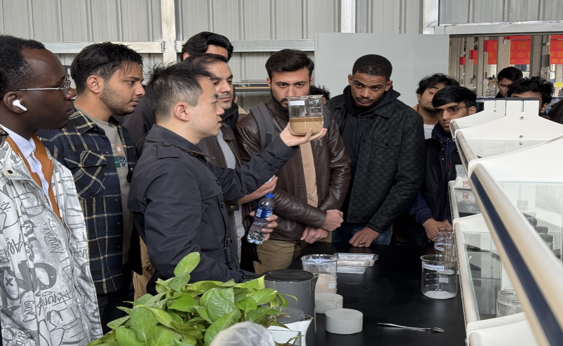 活動開始,留學(xué)生們來到西安湄南生物科技股份有限公司研發(fā)中心,認真觀察防沙治沙“黑科技”的合成,并與技術(shù)人員交流,詢問生產(chǎn)流程和技術(shù)細節(jié),感受中國企業(yè)為全球荒漠化治理的探索與創(chuàng)新。