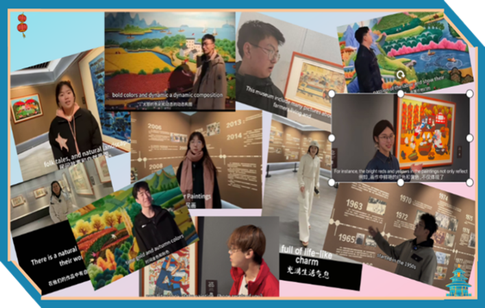 鄠邑農(nóng)民畫作為國家級非物質(zhì)文化遺產(chǎn),以原生態(tài)的鄉(xiāng)土題材、明快的色彩語言和質(zhì)樸的美學(xué)風(fēng)格蜚聲海內(nèi)外?;顒右潦?,學(xué)生通過鄠邑區(qū)農(nóng)民畫博物館專業(yè)講解員的講解和視頻觀看,系統(tǒng)學(xué)習(xí)了農(nóng)民畫六十余年的發(fā)展歷程,深刻理解了鄠邑農(nóng)民畫作品中蘊含的關(guān)中民俗、節(jié)慶文化與農(nóng)耕智慧。在隨后的實踐環(huán)節(jié)中,學(xué)生以小組為單位,結(jié)合英語語言優(yōu)勢與新媒體技術(shù)展開創(chuàng)作,進(jìn)行英文講解以及視頻拍攝工作。為了提升視頻質(zhì)量,活動開展前,除了對英文腳本反復(fù)修改,很多學(xué)生還自學(xué)了一些攝影技術(shù)并進(jìn)行分鏡腳本設(shè)計。活動現(xiàn)場,學(xué)生手持設(shè)備,穿梭于展廳進(jìn)行多角度講解拍攝。