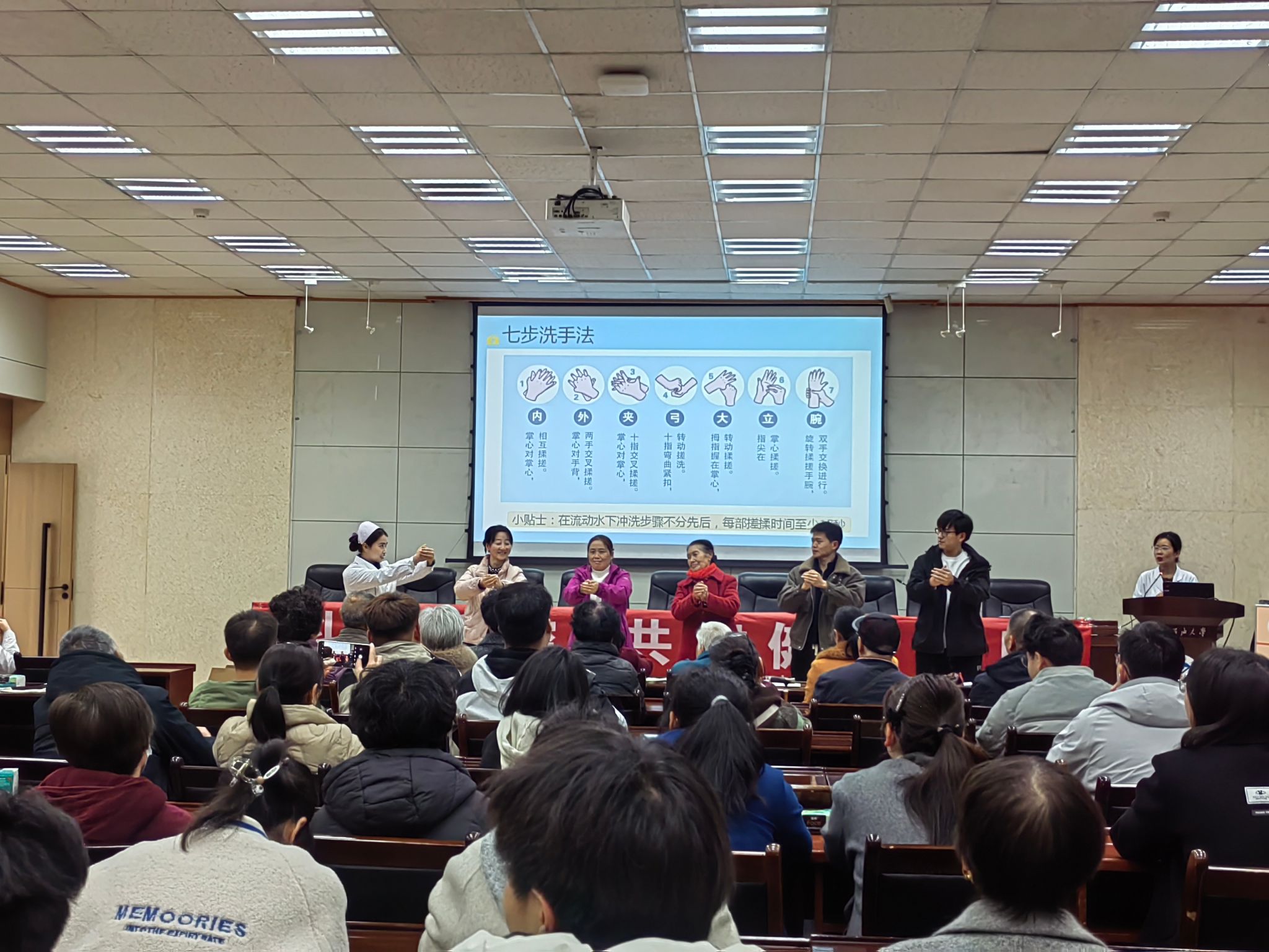 本次講座由校醫(yī)院經(jīng)驗豐富的主治醫(yī)師洪艷萍主講。講座中,洪醫(yī)生結合春季傳染病的流行特點,以通俗易懂的語言,詳細講解了流感、新冠、手足口、水痘、麻疹、諾如病毒感染等常見傳染病的發(fā)病癥狀、傳播途徑、預防措施等知識。同時,她還強調了保持良好個人衛(wèi)生習慣、加強體育鍛煉、及時接種疫苗等預防手段的重要性,并針對師生們提出的疑問進行了耐心解答。最后,還通過現(xiàn)場分解演示“七步洗手法”,細致講解每一步驟的要領,大家積極嘗試,并通過現(xiàn)場互動來強化記憶,現(xiàn)場氛圍濃厚,有效提升了師生日常防護意識及操作的規(guī)范性。