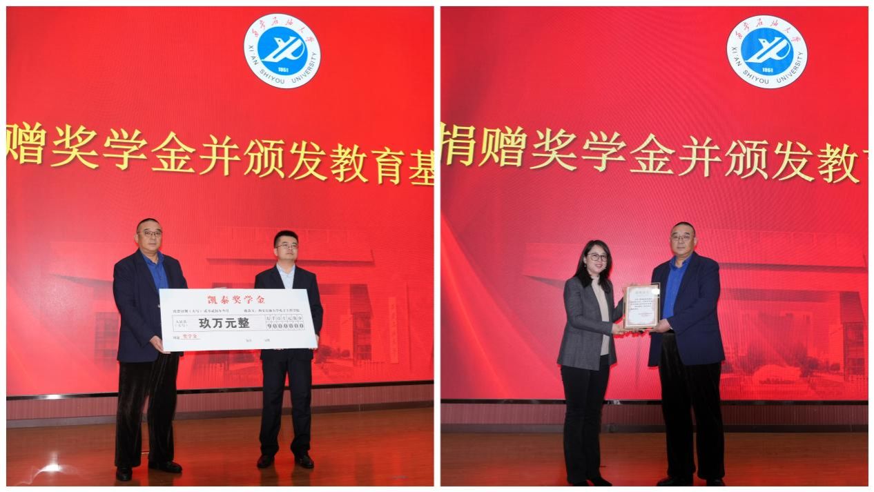 會前,趙健副校長與吳立中董事長進(jìn)行了深入交流,對企業(yè)近年來取得的蓬勃發(fā)展表示祝賀,對企業(yè)支持教育事業(yè)發(fā)展的善舉表示感謝。雙方表示要進(jìn)一步鞏固校企友誼,加強(qiáng)溝通與合作,推動校企雙方共同發(fā)展。儀式開始,凱泰石油機(jī)械有限公司董事長吳立中向?qū)W?;饡栀浟私逃?,潘娜向吳立中頒發(fā)了教育基金捐贈證書。