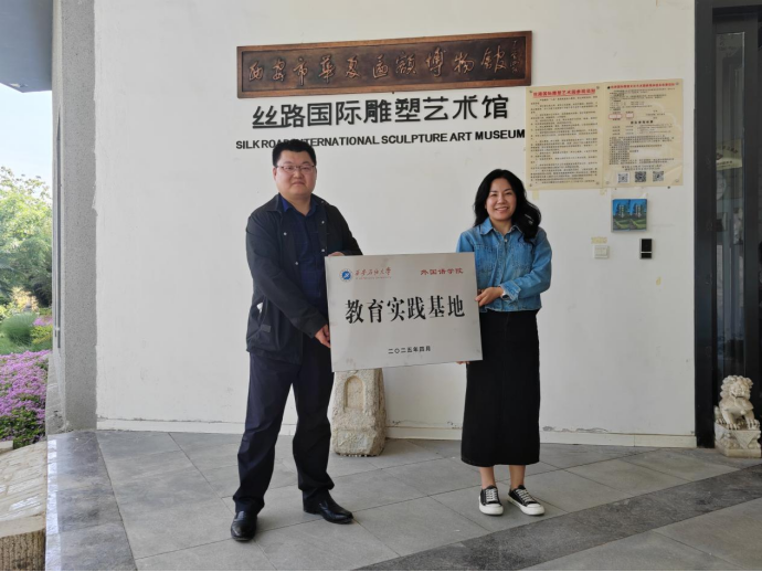 張建高、邱嶺與絲路國際雕塑文化藝術(shù)園負責人熱切交流。在交流中,雙方就合作的方向、內(nèi)容以及未來的發(fā)展規(guī)劃等進行了深入探討,在大家的共同見證下,外國語學院在絲路國際雕塑文化藝術(shù)園教育實踐基地正式掛牌。