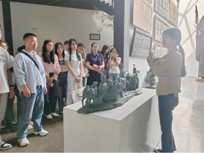 隨后,大家在講解員的引導下來到了絲路國際雕塑藝術(shù)館。這里展示了各種形態(tài)各異的雕塑作品,每一件作品都凝聚了藝術(shù)家的心血和智慧。師生黨員在欣賞雕塑藝術(shù)的同時,也感受到了多元文化交融。匾額作為中國傳統(tǒng)文化的重要組成部分,蘊含著豐富的歷史信息和文化內(nèi)涵。在這里,大家親眼見到了各種形狀、大小、材質(zhì)的匾額,每一塊匾額都承載著一段歷史故事和傳統(tǒng)文化。在講解員的解說下,大家對匾額的制作工藝、歷史背景和文化價值有了更深入的了解。
