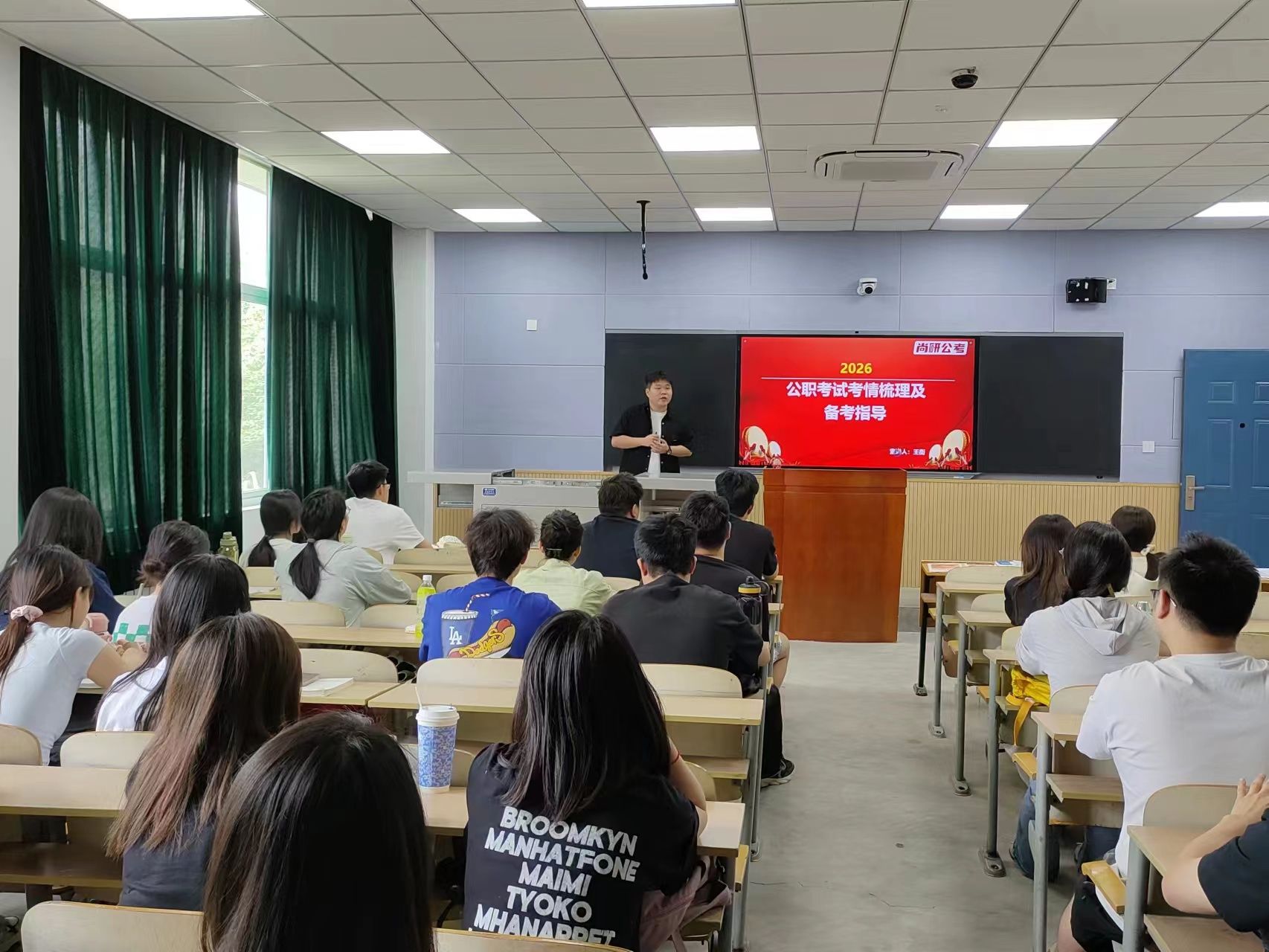 隨后,王蘅圍繞公考趨勢(shì)與備考策略展開專題指導(dǎo)。他以歷年數(shù)據(jù)為依托,深入分析了國(guó)考、省考、軍隊(duì)文職及事業(yè)單位考試的招錄條件、競(jìng)爭(zhēng)程度以及崗位特點(diǎn),并為學(xué)生預(yù)測(cè)了2026年考情變化趨勢(shì)。他指出:“要上岸,選對(duì)方向是關(guān)鍵。公職考試沒有最好的,只有最合適的。要結(jié)合自身專業(yè)背景以及未來發(fā)展規(guī)劃合理選擇?!?針對(duì)備考痛點(diǎn),王蘅為學(xué)生詳細(xì)講解了行測(cè)和申論的知識(shí)框架體系以及備考日程規(guī)劃,為學(xué)生們分享了許多切實(shí)有效的方法和技巧,幫助學(xué)生構(gòu)建科學(xué)備考體系。