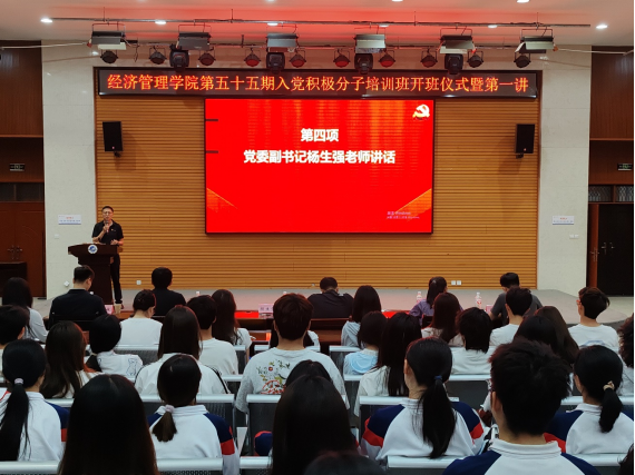 經(jīng)濟管理學院黨委副書記楊生強在開班典禮上講話。他代表經(jīng)濟管理學院黨委對參加本次培訓的入黨積極分子表示祝賀,對籌備本次培訓辛勤付出的黨工辦學生干部表示感謝。他對本期入黨積極分子參加培訓提出三點要求:一是要明確培訓意義,端正入黨動機;二是要珍惜學習機會,提升綜合素養(yǎng);三是要嚴守紀律要求,樹立良好形象,四是要以青春之我,擔時代之責。以本次培訓為起點,做到心中有信仰,堅定對馬克思主義的信仰、對中國特色社會主義的信念;肩上有擔當,在學習中勇攀高峰,在實踐中服務社會,用奮斗擦亮青春底色;腳下有方向,始終與黨和人民同向同行,努力成長為堪當民族復興大任的時代新人。