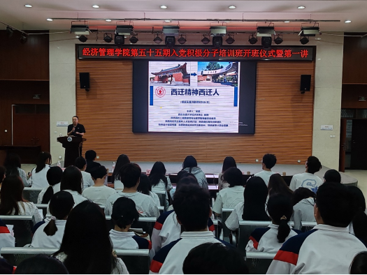 為深入貫徹習近平新時代中國特色社會主義思想,持續(xù)深化對西遷精神的領(lǐng)悟與傳承,引領(lǐng)入黨積極分子厚植心有大我、至誠報國的深厚情懷,5月7日,經(jīng)濟管理學院在鄠邑校區(qū)崇文樓118多功能廳舉行第五十五期入黨積極分子培訓班開班典禮暨黨課第一講。經(jīng)濟管理學院院長吳勛、黨委副書記楊生強、學生工作辦公室副主任張碩、輔導員曹萌、王中立,學生黨建工作辦公室指導老師王業(yè)林、學生黨建工作辦公室培訓部成員以及第五十五期入黨積極分子共計150余人參會。