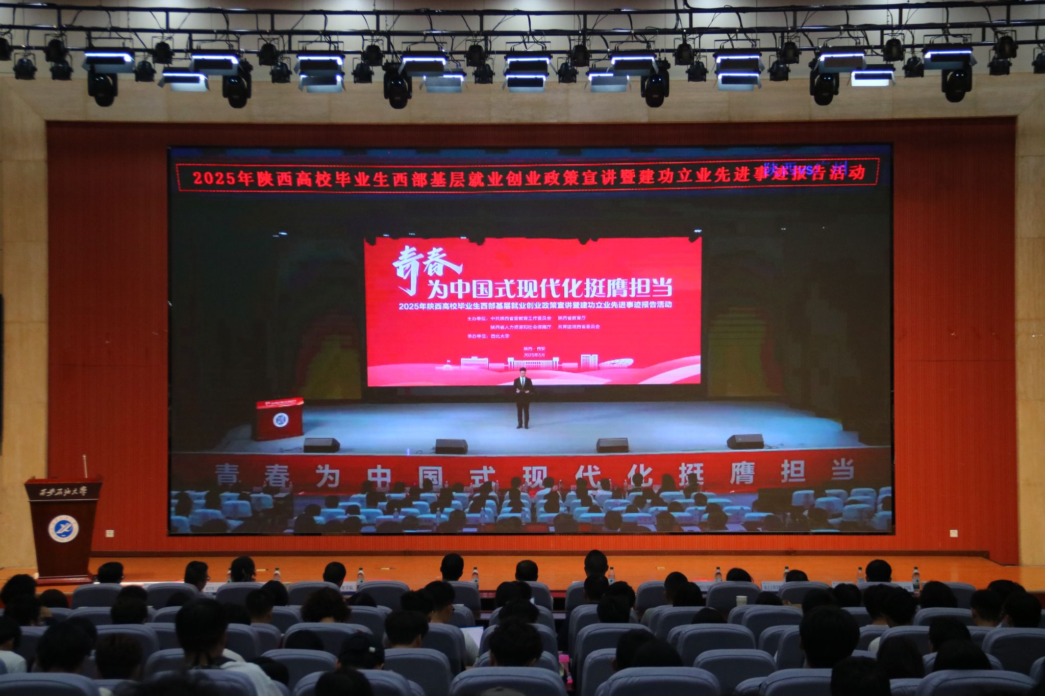 5月29日下午,2025年陜西高校畢業(yè)生西部基層就業(yè)創(chuàng)業(yè)政策宣講暨建功立業(yè)先進事跡報告活動省級報告會在西北大學舉辦。中共陜西省委教育工委副書記王海波、共青團陜西省委員會副書記惠旋、陜西省人才交流中心副主任李陽出席報告會。我校在鄠邑校弘石學術(shù)報告廳設立分會場,副校長趙健,黨委學生工作部、校團委、各院(系)主管學生工作負責人、輔導員代表及學生代表400余人參加了報告會。