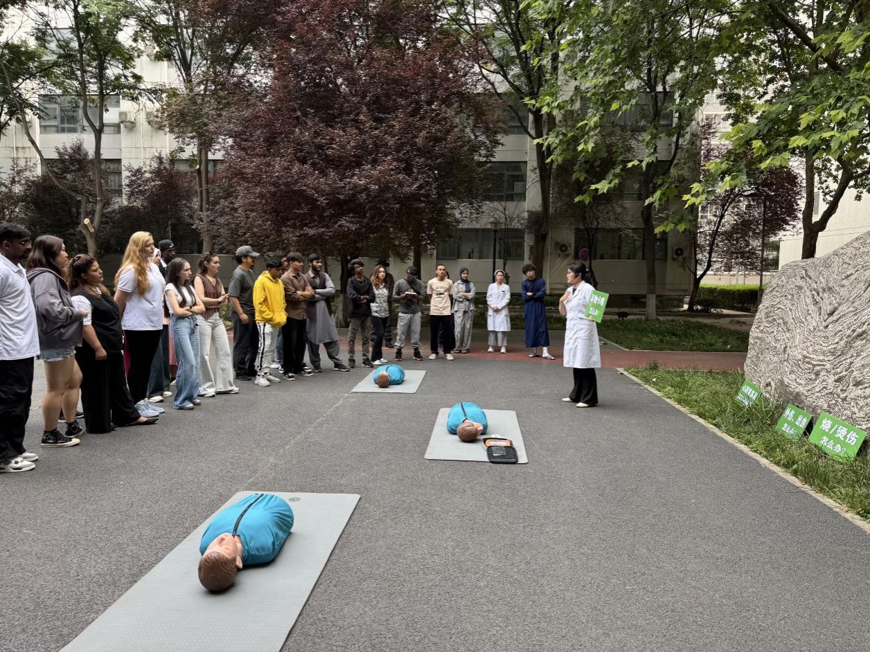 2025年6月5日上午,國際教育學院聯(lián)合校醫(yī)院在明德校區(qū)6號樓前廣場成功舉辦應急救護專題培訓活動。培訓特邀校醫(yī)院中國紅十字會認證救護師宋彥霞、譚亞護士以及李純護士現(xiàn)場講授,學院輔導員及20國40余名留學生積極參訓。