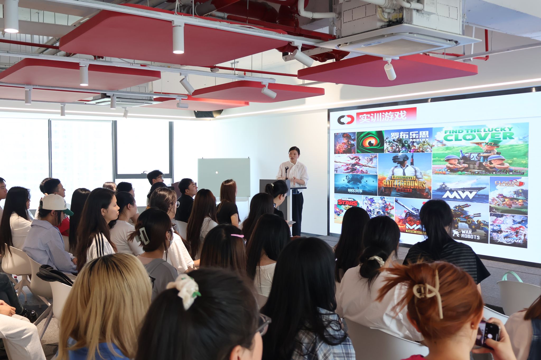栢奕集團(tuán)招聘負(fù)責(zé)人曹孔首先介紹了實(shí)習(xí)生培訓(xùn)管理體系,并講解了企業(yè)與多方合作開(kāi)發(fā)手游的模式,展示了公司文化標(biāo)識(shí)和特色辦公環(huán),帶領(lǐng)師生實(shí)地參觀游戲研發(fā)部、項(xiàng)目發(fā)展部等部門,了解游戲視頻制作流程及工作環(huán)境。