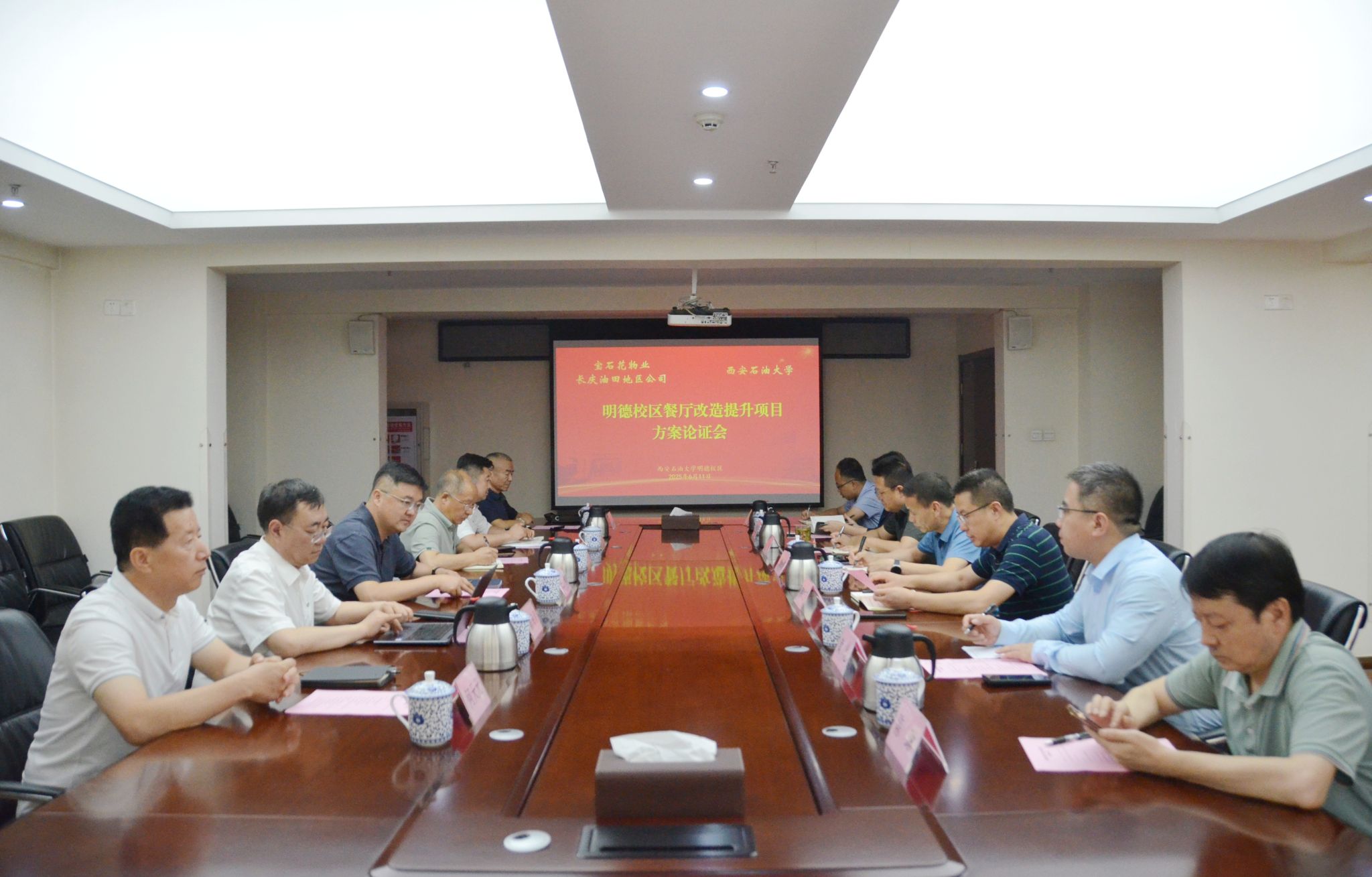 6月11日下午,學(xué)校與寶石花物業(yè)長慶油田地區(qū)公司在明德校區(qū)召開“明德校區(qū)餐廳改造提升項目”方案論證會,雙方圍繞項目設(shè)計方案進(jìn)行深入研討,進(jìn)一步優(yōu)化功能布局。寶石花物業(yè)長慶油田地區(qū)公司市場部總監(jiān)王恒、運營部工程管理主任李建寧等6人,我校研究生工作部、后勤處、國際教育學(xué)院及繼續(xù)教育學(xué)院負(fù)責(zé)人參加會議。會議由繼續(xù)教育學(xué)院(培訓(xùn)中心)院長(主任)林紅先主持。