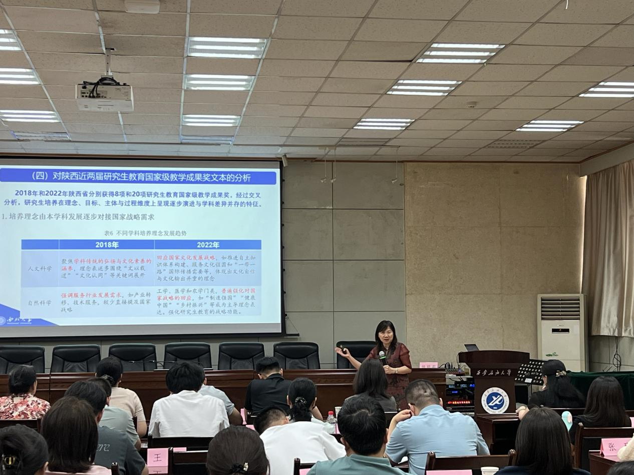 西北大學(xué)姚聰莉教授以《教學(xué)成果獎(jiǎng)的詞云分析及成果培育》為題,首先從培養(yǎng)理念、目標(biāo)、主體和過程四個(gè)視角,對(duì)前三屆國(guó)家級(jí)教學(xué)成果獎(jiǎng)做了詞云分析,梳理出人才培養(yǎng)范式的基本特征和變化趨勢(shì)。進(jìn)而圍繞教學(xué)成果獎(jiǎng)的內(nèi)涵特征、培育路徑、申報(bào)書撰寫與成果凝練、申報(bào)注意事項(xiàng)等方面進(jìn)行了系統(tǒng)講解。她強(qiáng)調(diào),教學(xué)成果應(yīng)體現(xiàn)鮮明的時(shí)代特征、突出的問題導(dǎo)向與創(chuàng)新意識(shí),同時(shí)應(yīng)在理論高度、實(shí)踐基礎(chǔ)與應(yīng)用成效上實(shí)現(xiàn)有機(jī)統(tǒng)一。成果培育要聚焦關(guān)鍵問題、破解改革難題,注重?cái)?shù)據(jù)支撐和以學(xué)生為中心的成果提煉原則。并建議盡早謀劃,集結(jié)力量開展協(xié)同攻關(guān),整合資源、打造優(yōu)勢(shì)互補(bǔ)的團(tuán)隊(duì),實(shí)現(xiàn)科研反哺教學(xué),推動(dòng)高質(zhì)量成果產(chǎn)出。