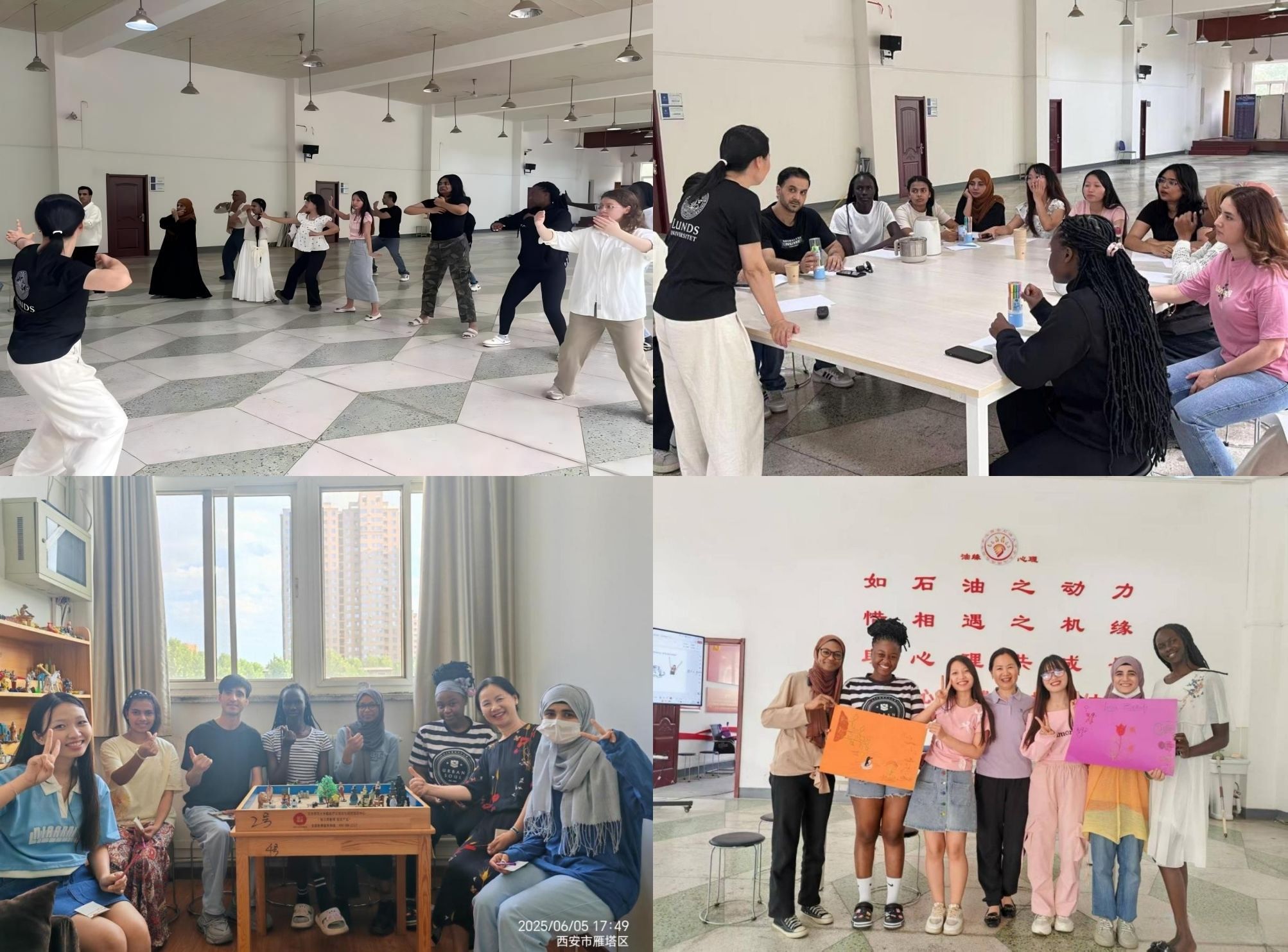 本期工作坊基于跨文化心理學(xué)相關(guān)理論,專(zhuān)為提升國(guó)際學(xué)生心理適應(yīng)能力而設(shè)計(jì)?;顒?dòng)圍繞“相遇在西安石油大學(xué)”“積極心態(tài)的構(gòu)建”“適應(yīng)過(guò)程中的挫折與成長(zhǎng)”“期待與祝福”四個(gè)主題開(kāi)展。每場(chǎng)工作坊均以中國(guó)傳統(tǒng)健身氣功八段錦開(kāi)場(chǎng)熱身,引導(dǎo)參與者分享個(gè)人文化背景與在校經(jīng)歷,并通過(guò)建立積極心態(tài)、尋求社會(huì)支持、實(shí)現(xiàn)自我成長(zhǎng)、共繪發(fā)展愿景等環(huán)節(jié)進(jìn)行敘事重構(gòu),切實(shí)提升國(guó)際學(xué)生的跨文化心理適應(yīng)能力。
