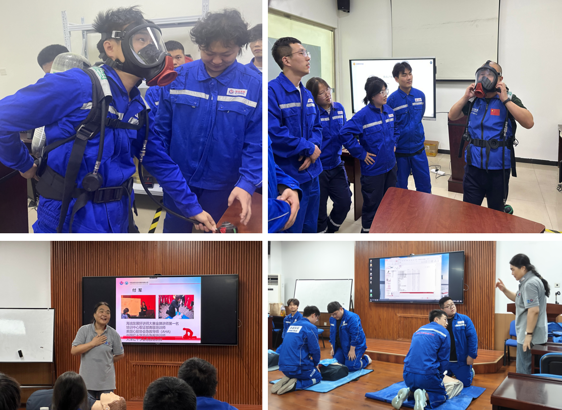 教學團隊圍繞“海上油田安全優(yōu)先”,講解安全用具使用與維護,演示正壓式空氣呼吸器等裝備穿戴;結(jié)合案例引導(dǎo)學生多維度評估海上平臺風險,樹立“預(yù)防為先”理念。而后的應(yīng)急技能培訓則側(cè)重實戰(zhàn),學生分組演練心肺復(fù)蘇術(shù)(CPR)與自動體外除顫儀(AED)操作,并模擬煙熱環(huán)境中的火災(zāi)逃生,強化應(yīng)急自救能力。