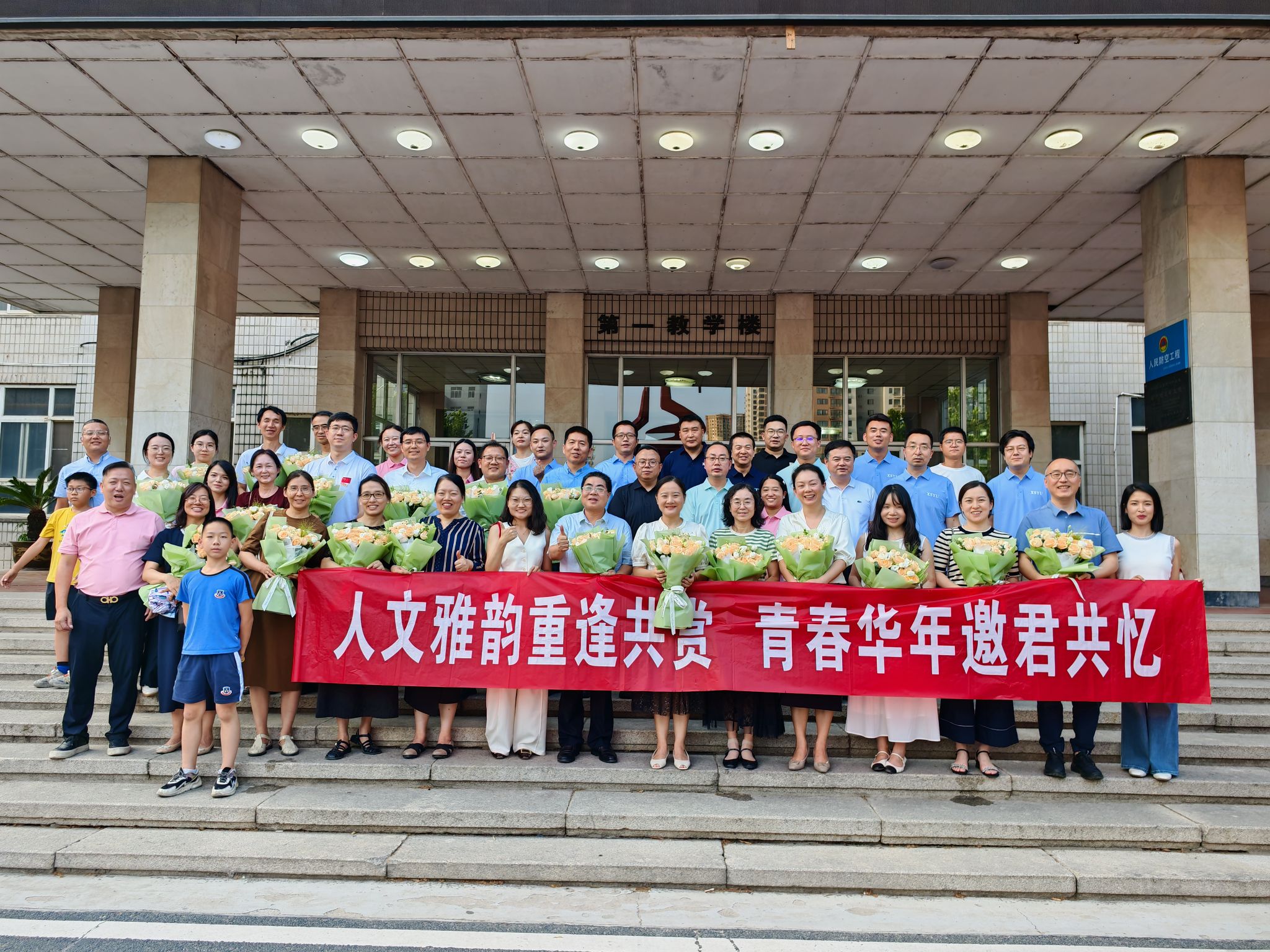 合影。2002級漢語言文學專業(yè)校友代表劉凱揚為全體教師獻花,與會人員在教學樓前合影留念,鏡頭定格下了這難忘的一刻。每個人的臉上都洋溢著幸福的笑容,那是對過去美好時光的懷念,也是對未來共同發(fā)展的期待。