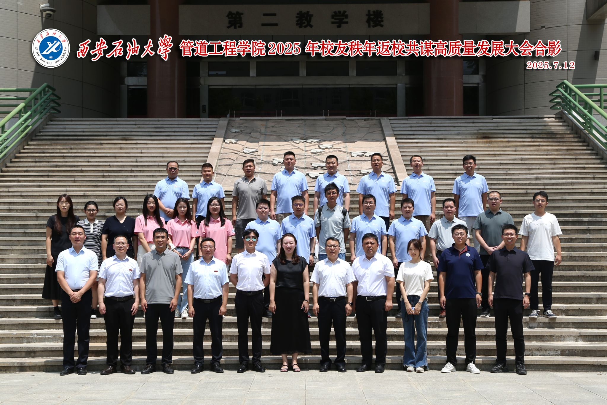 7 月 12 日上午,“西安石油大學 2025 年校友秩年返校共謀高質(zhì)量發(fā)展大會”隆重舉行。來自管道工程學院2015 屆的司軒宇、楊正軍、安樂、李佩、長孫思萌等43 位校友代表,身著統(tǒng)一服裝,滿懷激動之情全程參與了此次大會。在大會現(xiàn)場,學院工程管理系主任董鳴皋作為教師代表,接受了校友們獻上的鮮花,這一溫馨場景成為了大會中的一抹亮色。