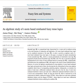 發(fā)表在Fuzzy Sets and System的論文“An algebraic study of t-norm based residuated fuzzy tense logics”主要研究了基于三角模的剩余模糊時(shí)態(tài)邏輯的代數(shù)理論,理學(xué)院王軍濤副教授為論文的第一作者,西安石油大學(xué)理學(xué)院為論文的第一署名單位。1986年,著名邏輯學(xué)家W.B. Ewald在論文[Intuitionistic tense and modal logic, Journal ofSymbolicLogic,51 (1986)]中構(gòu)建了直覺(jué)時(shí)態(tài)邏輯的公理系統(tǒng)IKt.本文指出了IKt并非是獨(dú)立的,在此基礎(chǔ)之上構(gòu)建了基于三角模剩余模糊時(shí)態(tài)邏輯的公理化系統(tǒng),并從泛代數(shù)角度通過(guò)語(yǔ)義擴(kuò)張形式構(gòu)建了基于三角模剩余模糊時(shí)態(tài)邏輯的代數(shù)語(yǔ)義體系,進(jìn)而為剩余模糊時(shí)態(tài)邏輯提供了統(tǒng)一的代數(shù)處理框架,同時(shí)從范疇角度找到了時(shí)態(tài)剩余格范疇的等價(jià)范疇,得到了其一種簡(jiǎn)易化的表示性定理。
