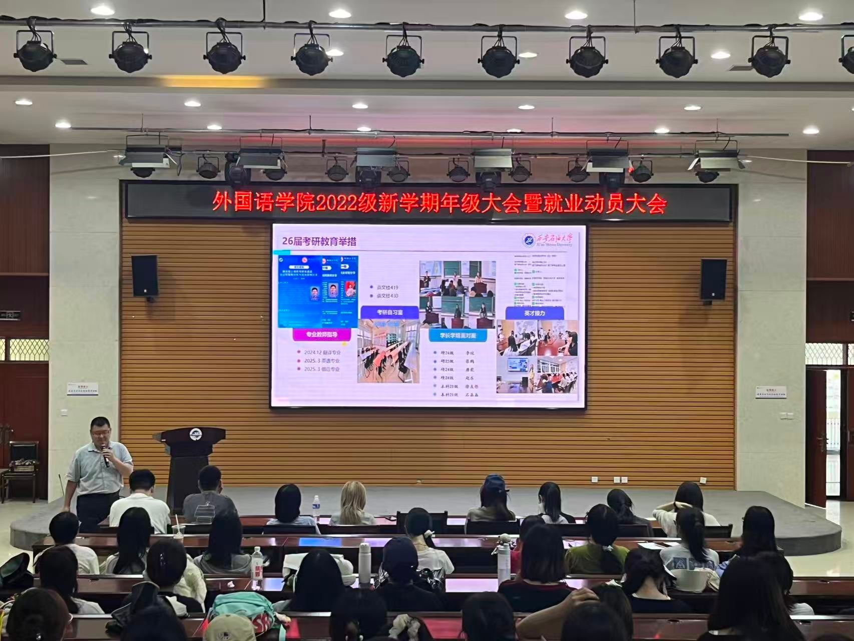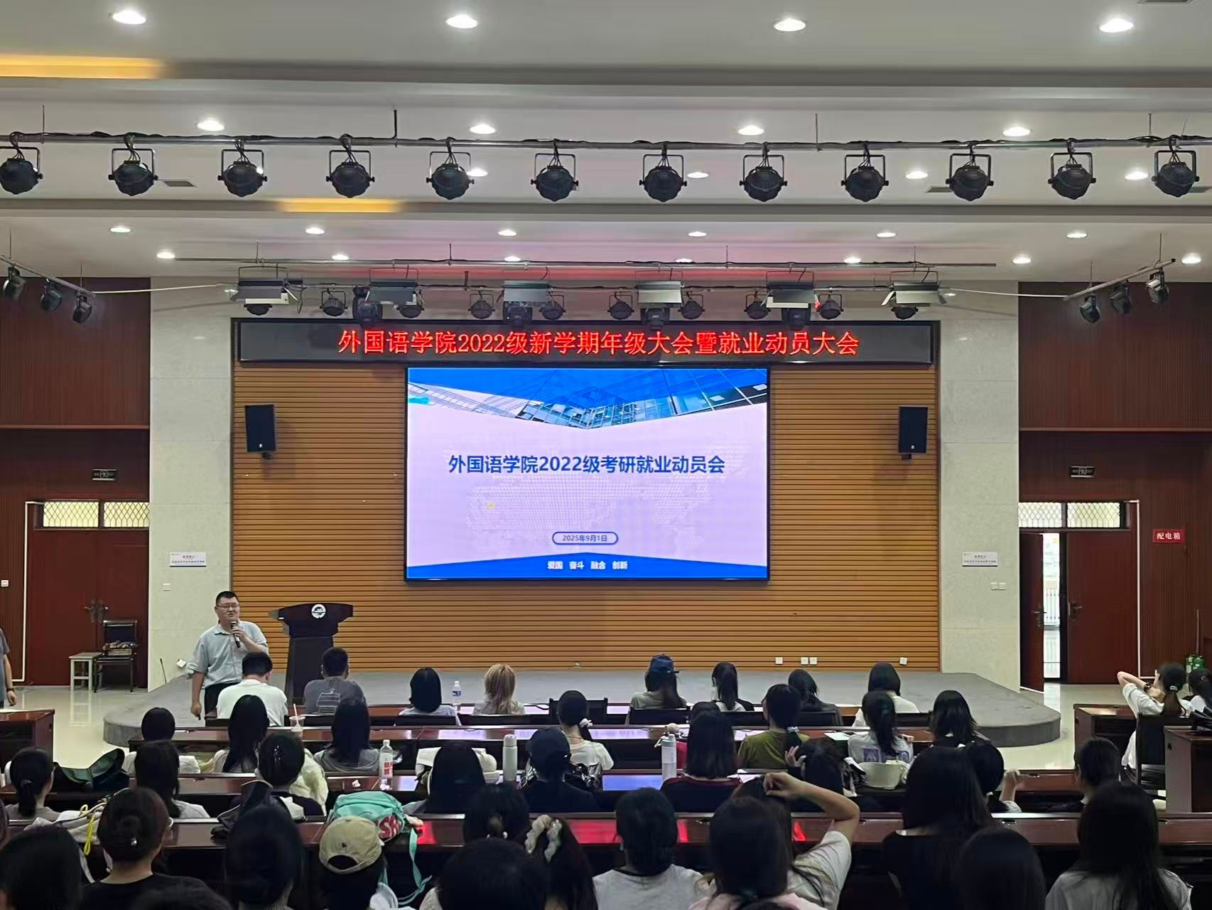 為貫徹落實(shí)學(xué)校工作要求,引導(dǎo)畢業(yè)生樹立正確就業(yè)觀念,提高就業(yè)積極性和主動(dòng)性,助力畢業(yè)生順利求職升學(xué),9月1日,外國(guó)語學(xué)院在崇文樓108室召開2026屆畢業(yè)生就業(yè)動(dòng)員大會(huì)。外國(guó)語學(xué)院黨委副書記、畢業(yè)班輔導(dǎo)員、學(xué)院畢業(yè)生近200人參加會(huì)議。會(huì)議由院團(tuán)委書記陳浩主持。