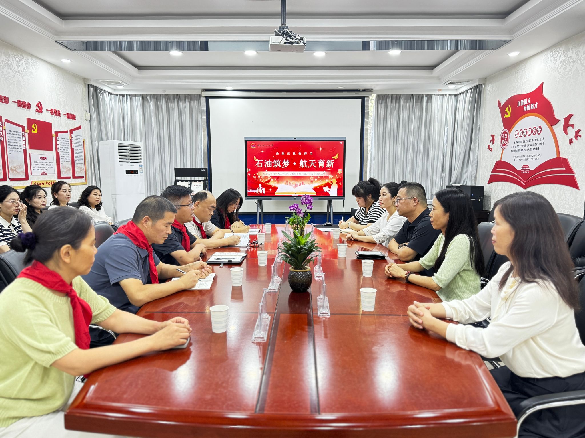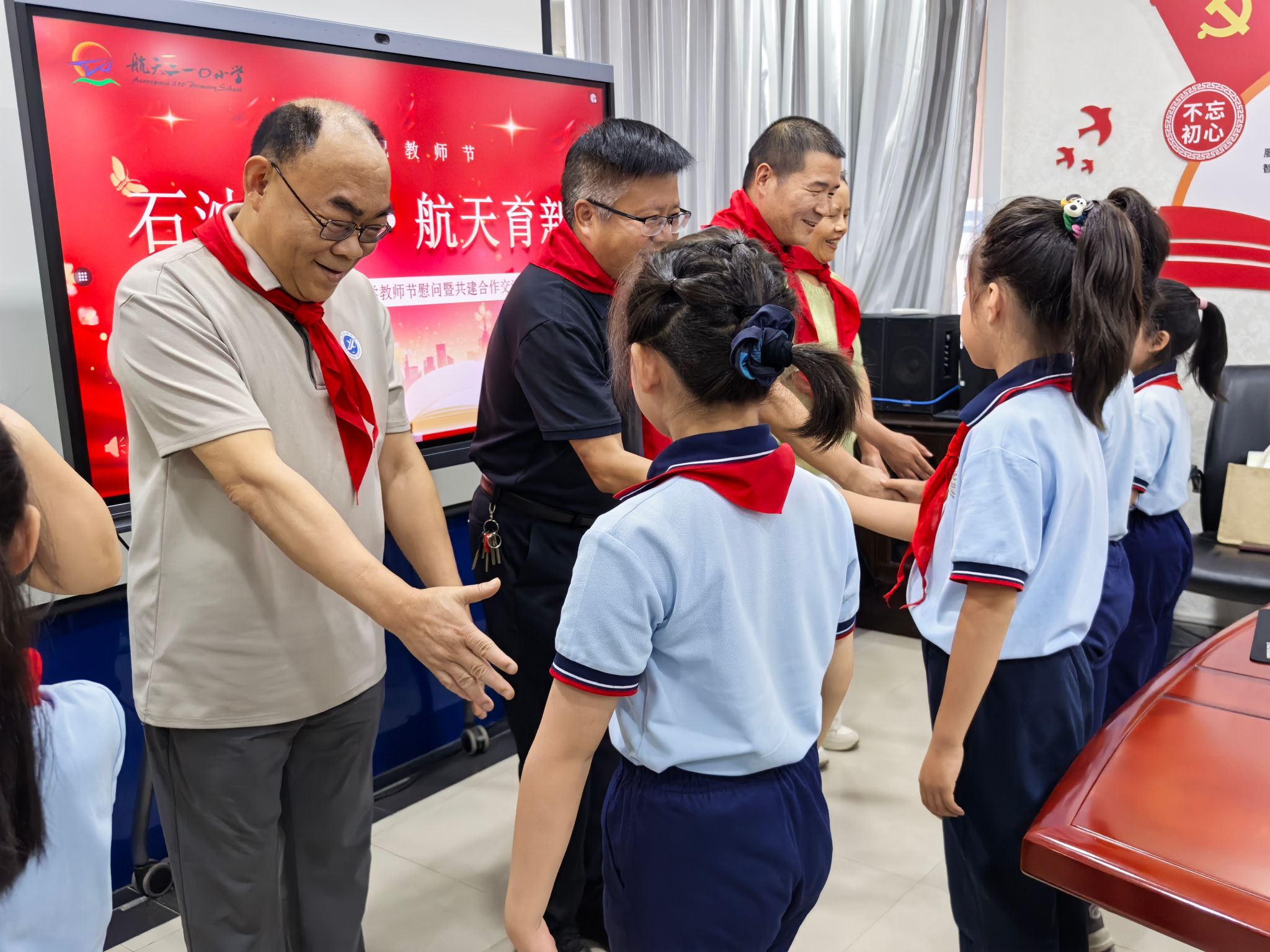 慶祝教師節(jié)活動(dòng)上,航天210小學(xué)的少先隊(duì)員代表為張驍勇一行敬獻(xiàn)了紅領(lǐng)巾?;顒?dòng)結(jié)束后,雙方就合作共建的具體事項(xiàng)進(jìn)行了深入交流。