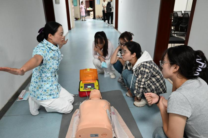 培訓(xùn)以“技能操作”為核心內(nèi)容,涵蓋心搏驟?,F(xiàn)場對成人進行心肺復(fù)蘇和使用自動體外除顫器(AED)、氣道異物梗阻現(xiàn)場應(yīng)用海姆立克急救法救助病患,以及緊急傷口包扎等實操技能的演示教學。